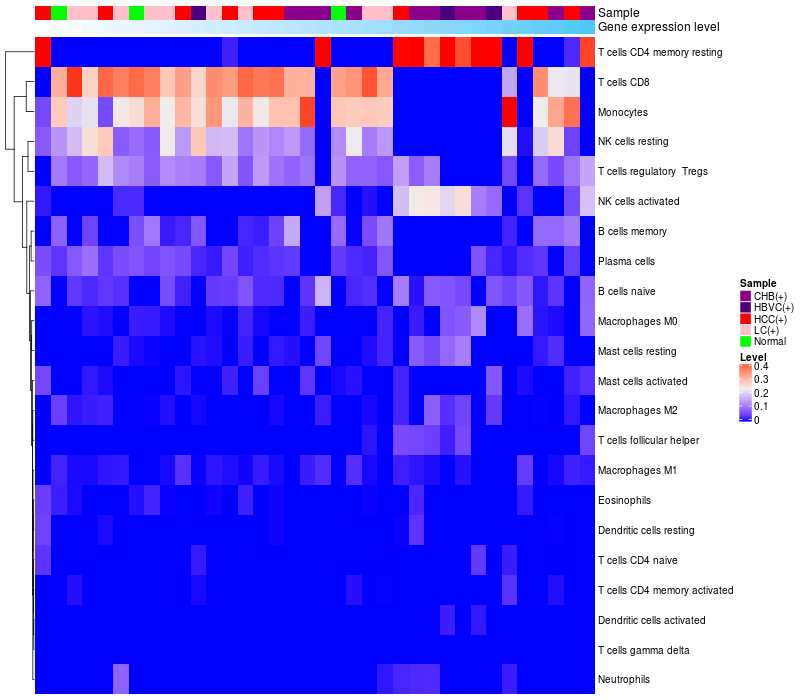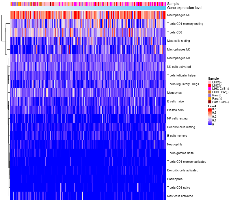 Liver hepatocellular carcinoma HCV (HBV+)(86), Liver hepatocellular carcinoma HCV (HBV-)(19), Liver hepatocellular carcinoma (HBV+)(209), Liver hepatocellular carcinoma (HBV+)(60), Paracancerous HCV (HBV+)(4), Paracancerous (HBV-)(28), Paracancerous (HBV+)(18) |