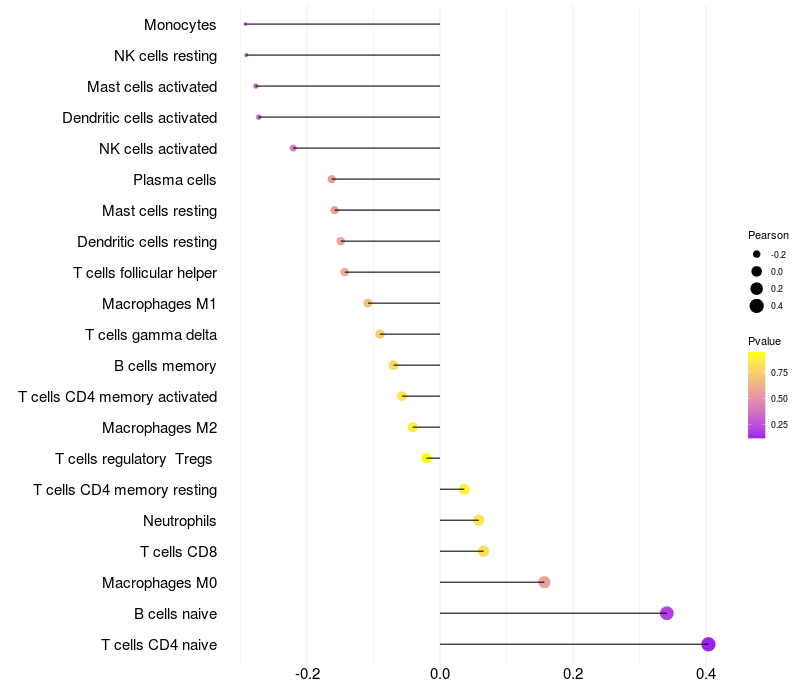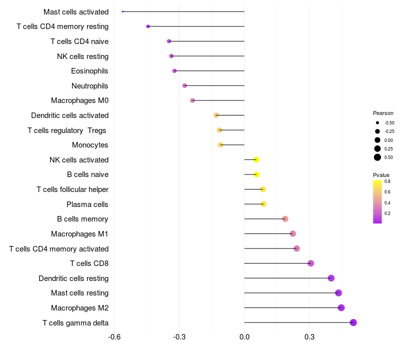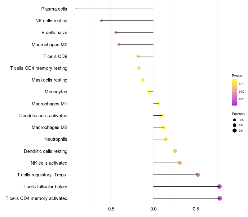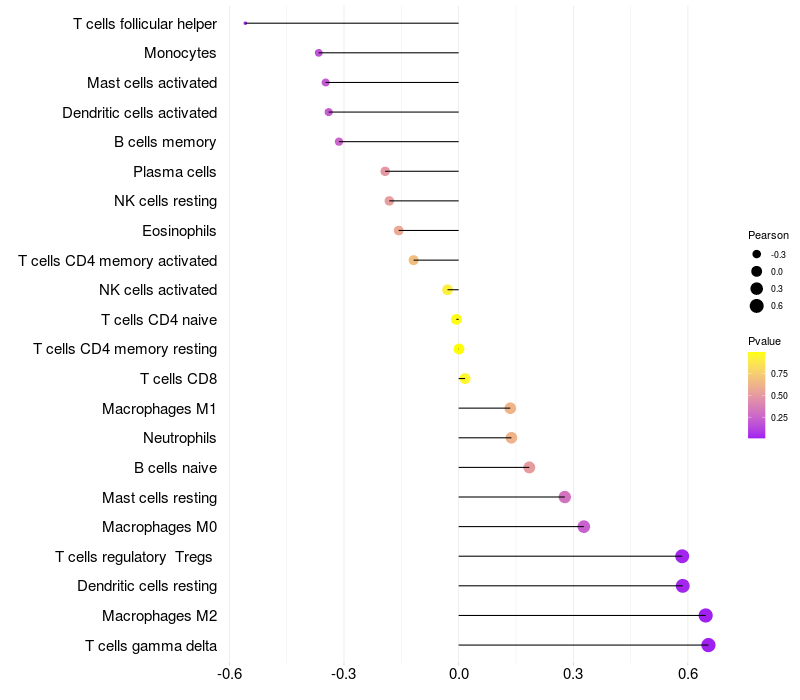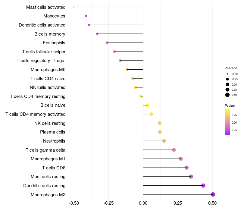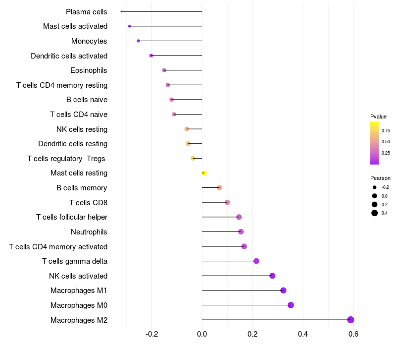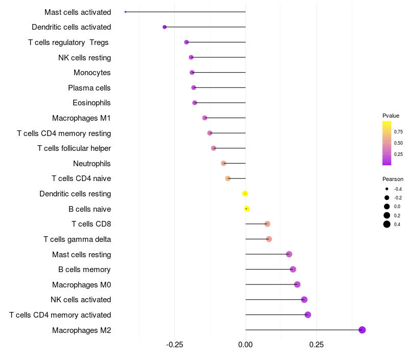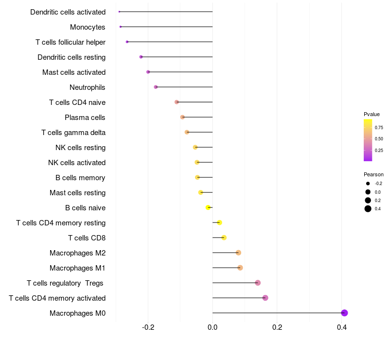 Lollipop of CCL18 expression and immune infiltrating cell level correlation result in HPV+ samples