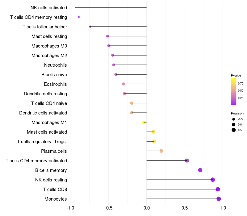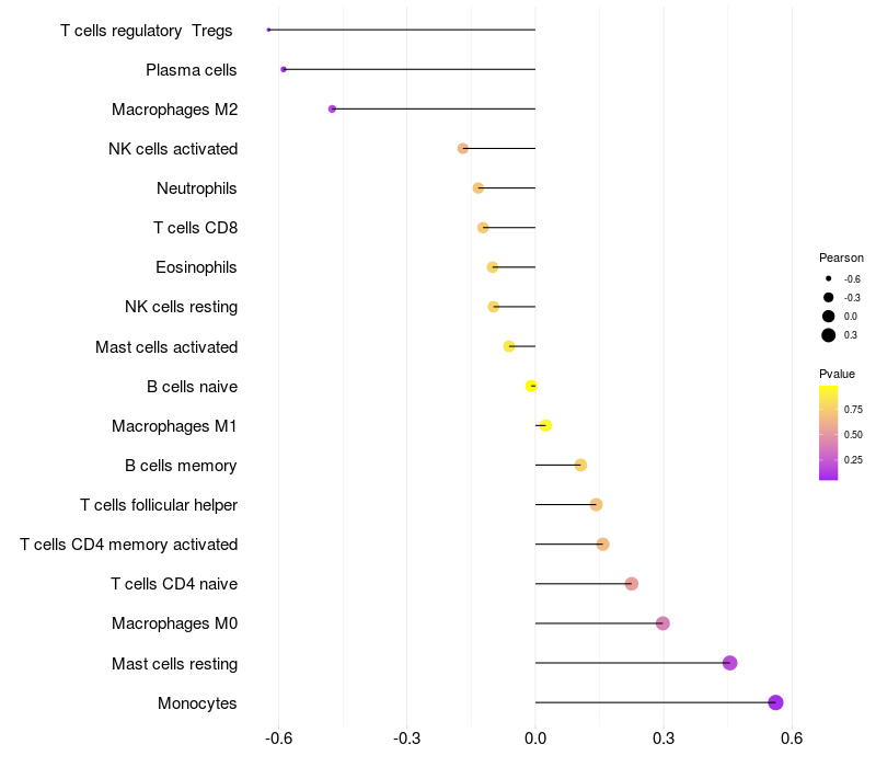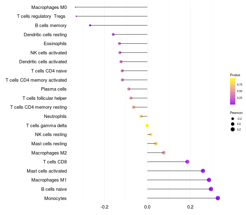 Lollipop of CD14 expression and immune infiltrating cell level correlation result in HBV+ Liver cirrhosis samples