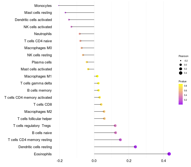 Lollipop of CD163L1 expression and immune infiltrating cell level correlation result in HBV+ Liver cirrhosis samples