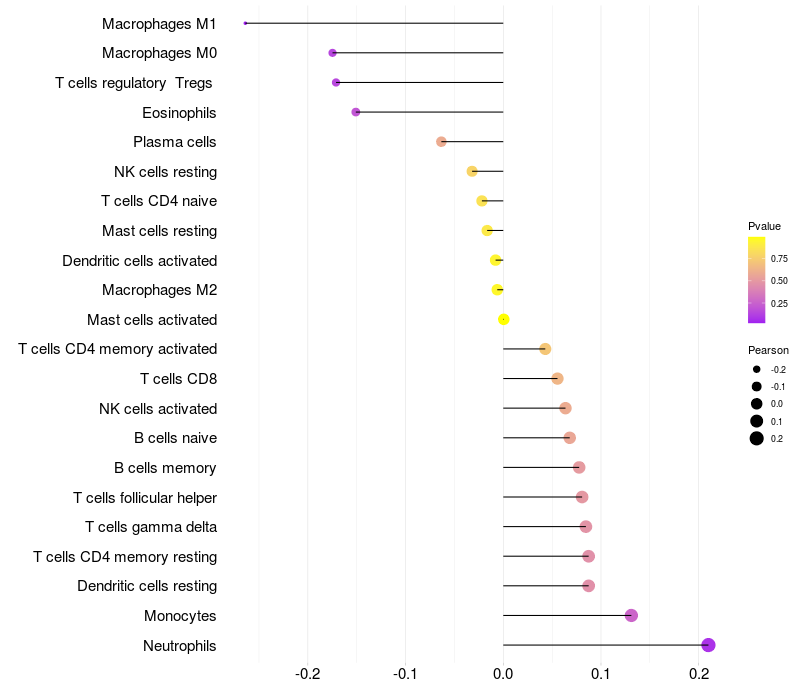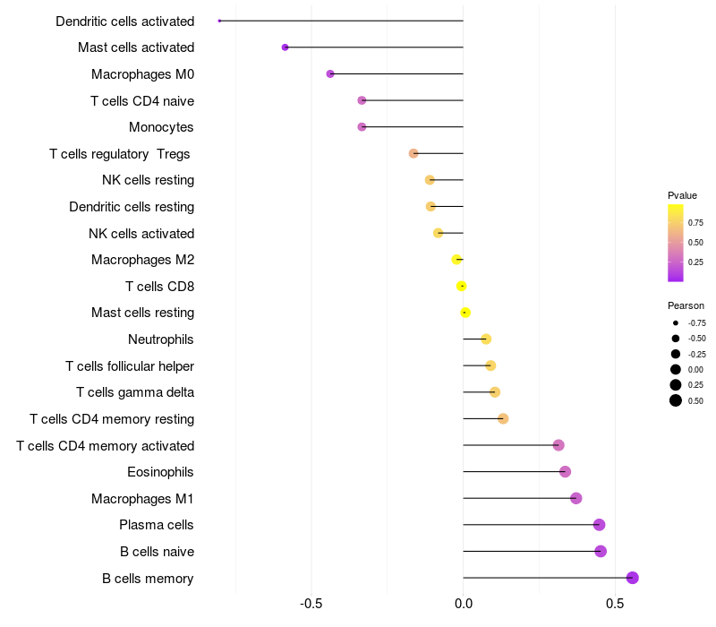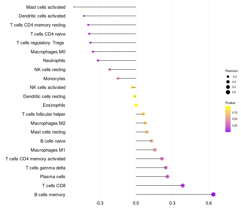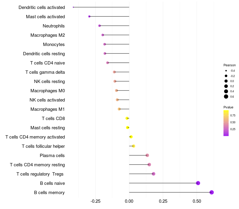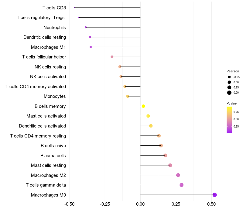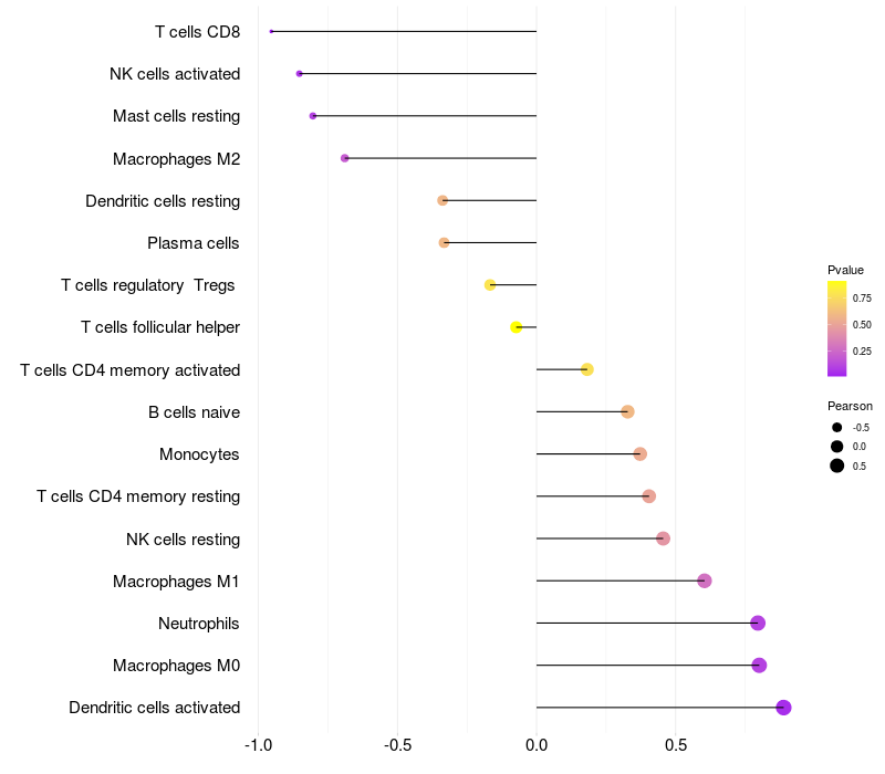 Lollipop of CD180 expression and immune infiltrating cell level correlation result in HPV+ samples