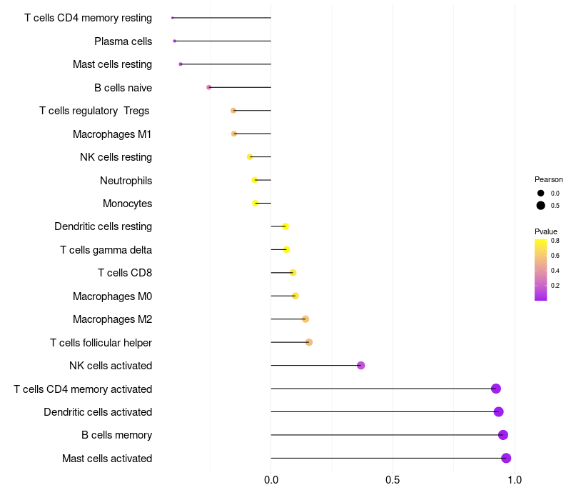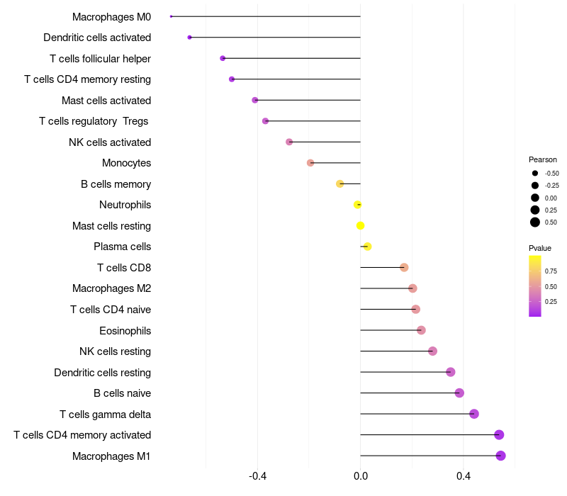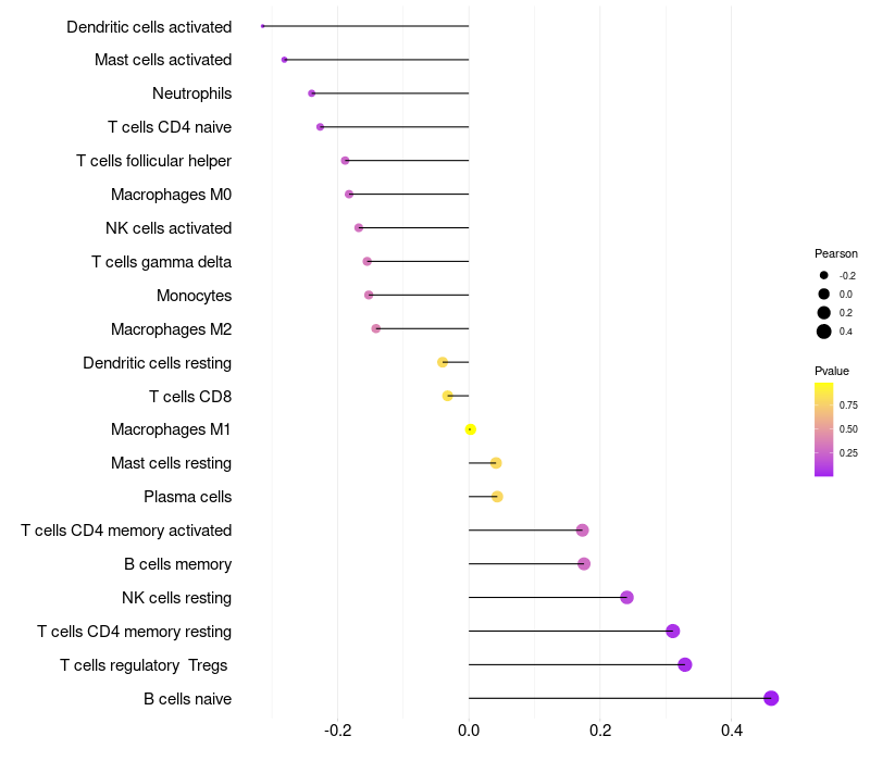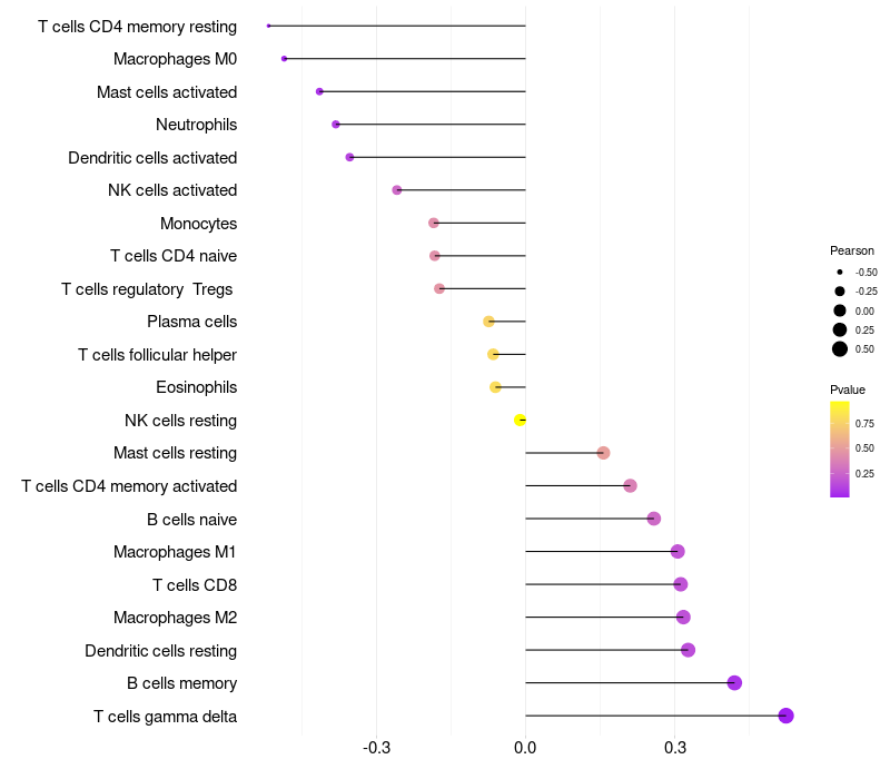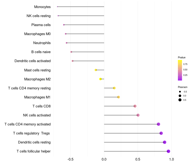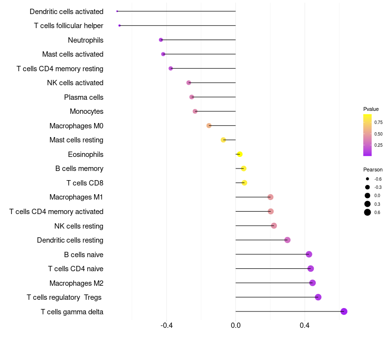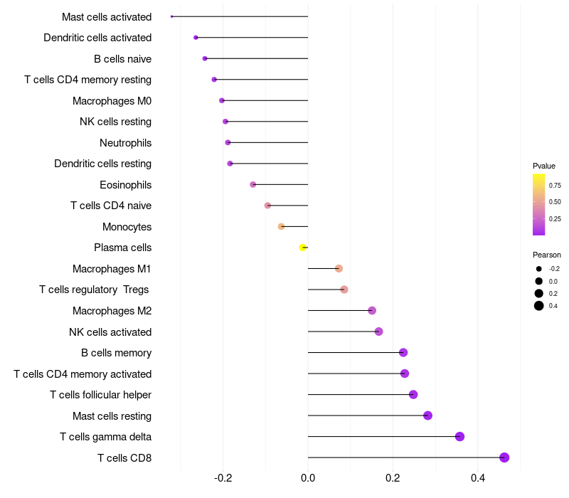 Lollipop of CD200R1 expression and immune infiltrating cell level correlation result in HPV+ samples