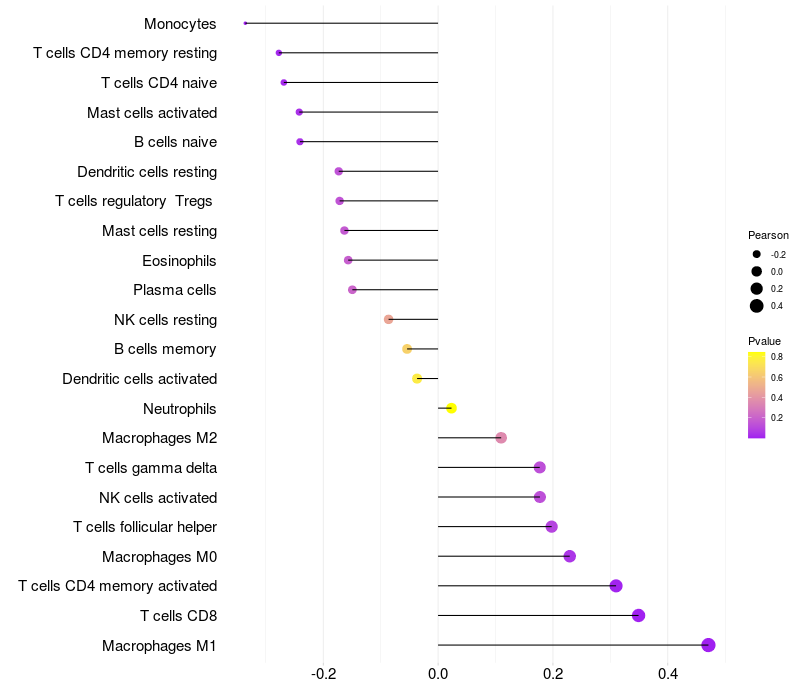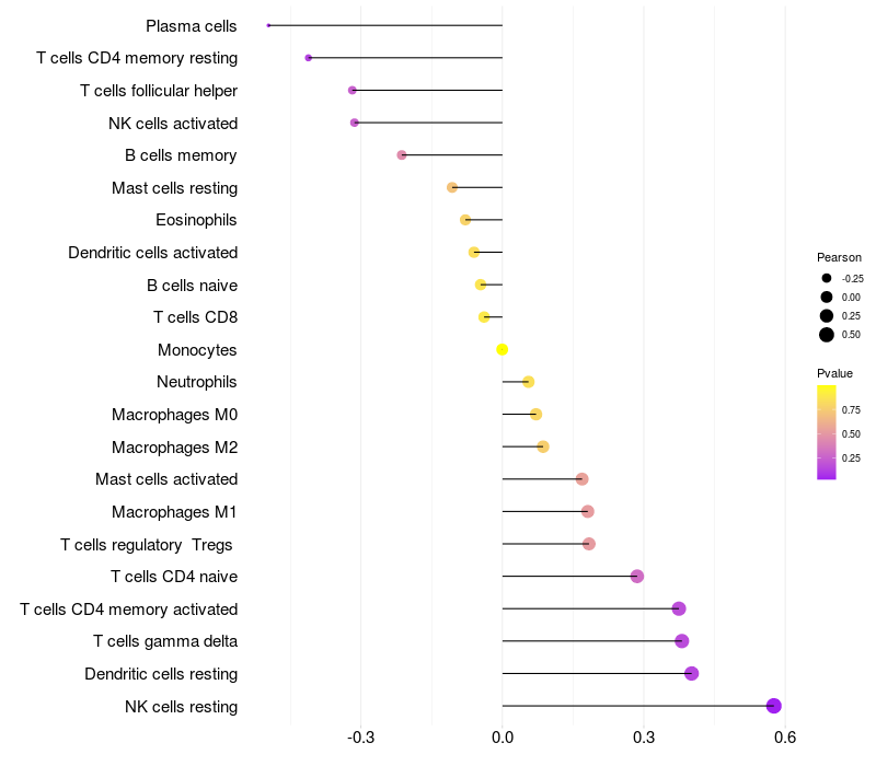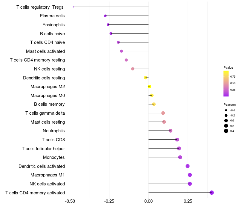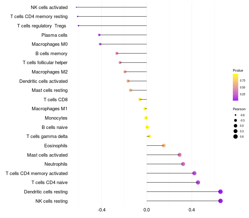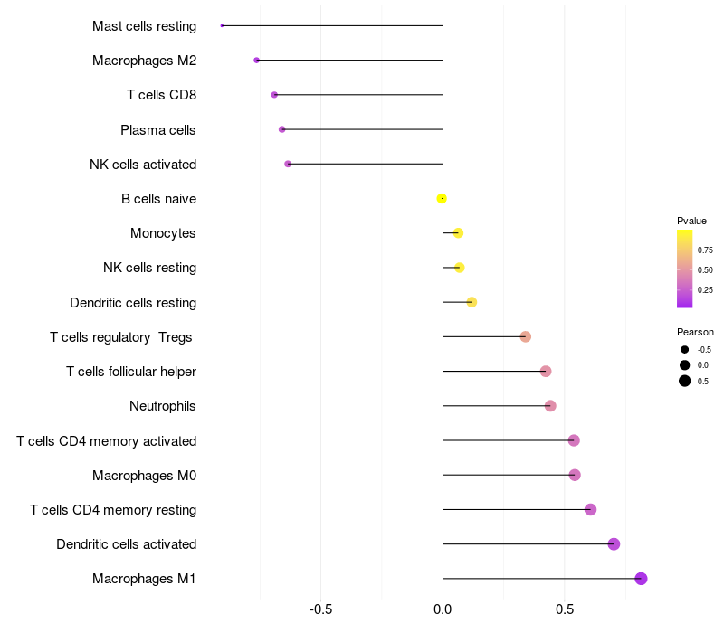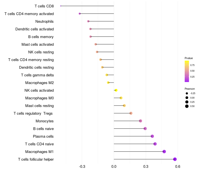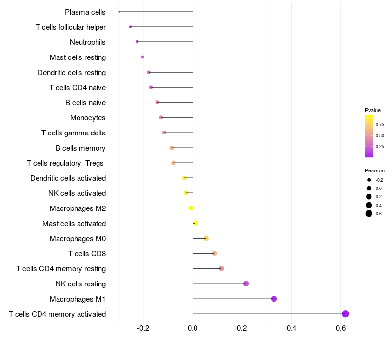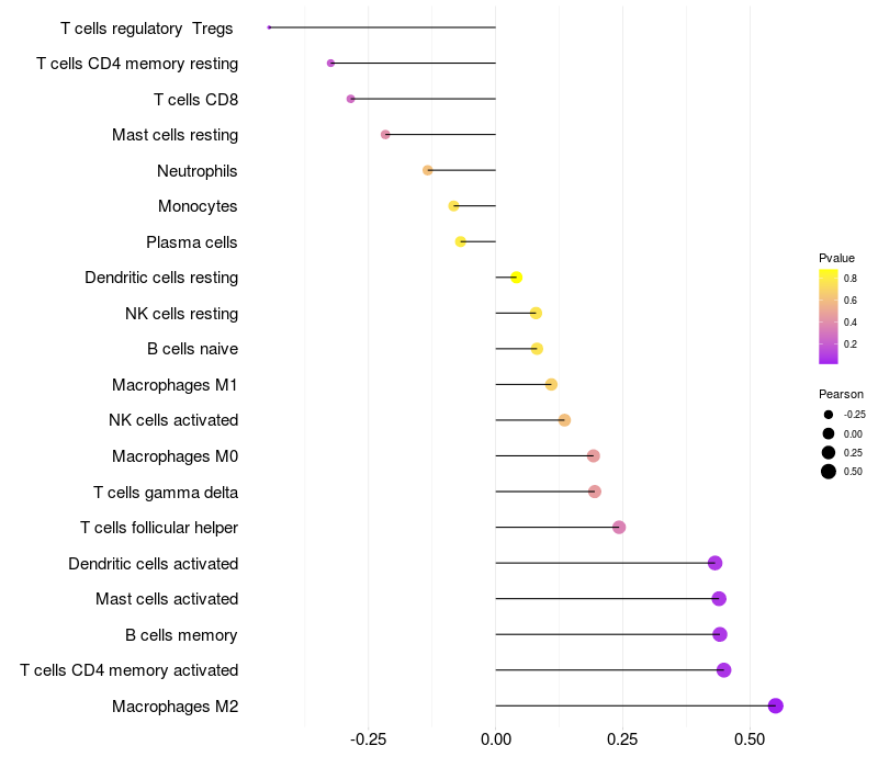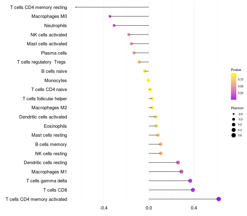 Lollipop of CD274 expression and immune infiltrating cell level correlation result in HPV+ samples
