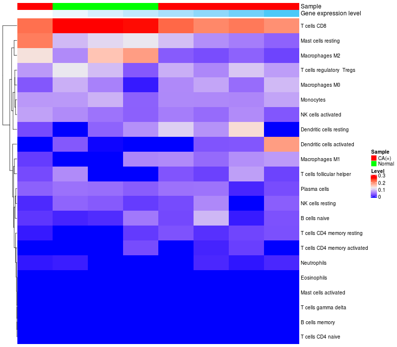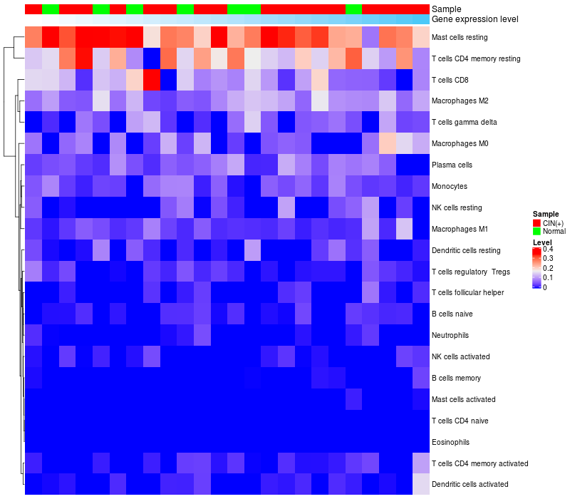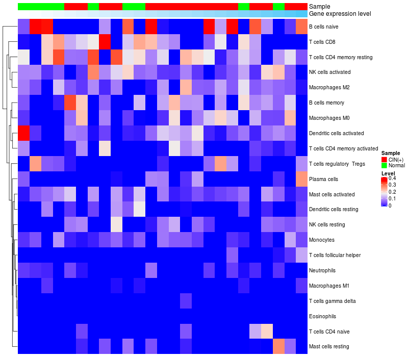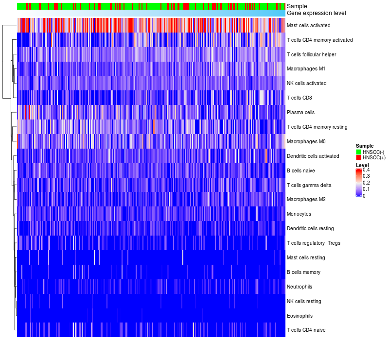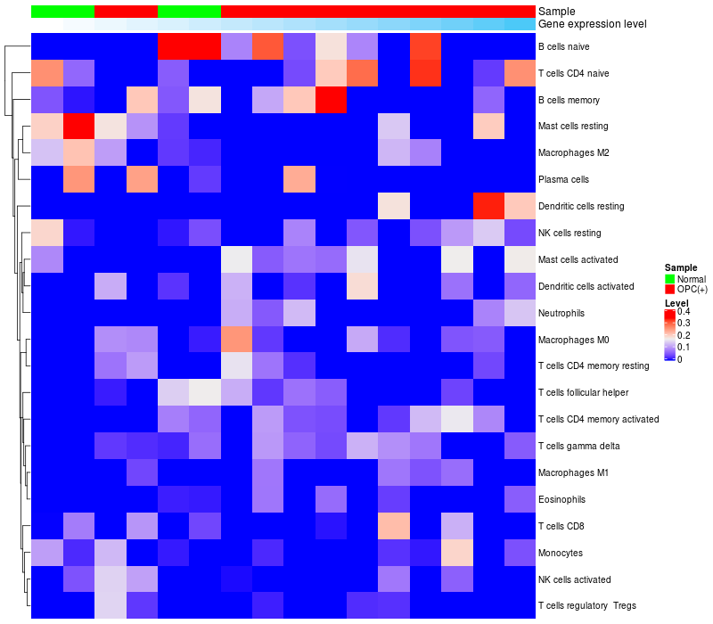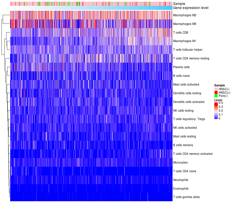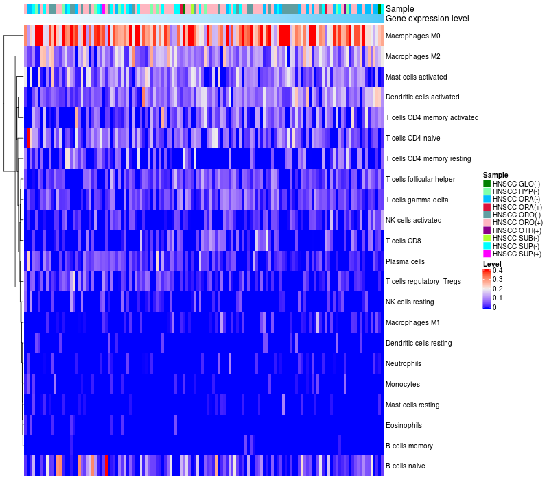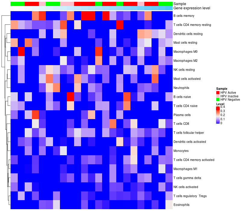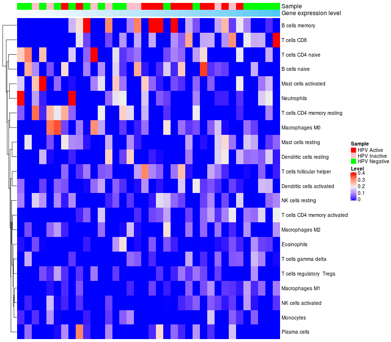 Lollipop of CD274 expression and immune infiltrating cell level correlation result in HPV+ samples