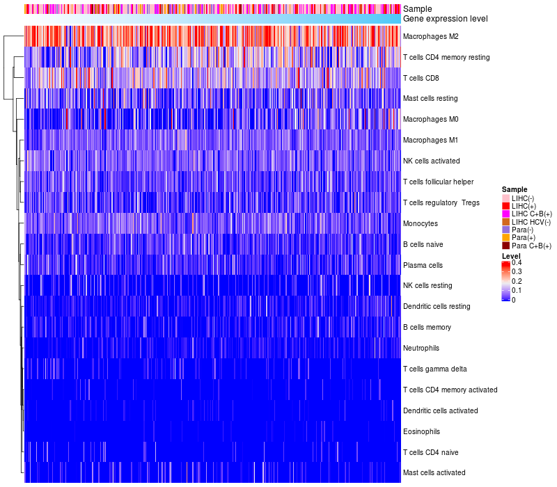 Liver hepatocellular carcinoma HCV (HBV+)(86), Liver hepatocellular carcinoma HCV (HBV-)(19), Liver hepatocellular carcinoma (HBV+)(209), Liver hepatocellular carcinoma (HBV+)(60), Paracancerous HCV (HBV+)(4), Paracancerous (HBV-)(28), Paracancerous (HBV+)(18) |