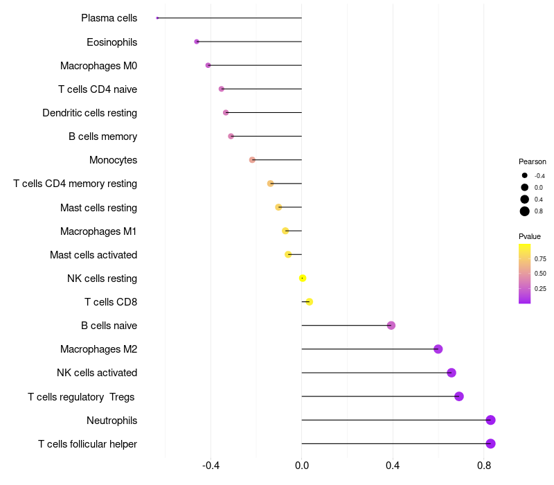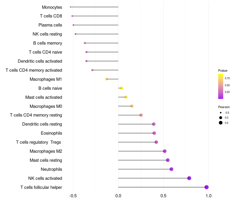 Lollipop of CD34 expression and immune infiltrating cell level correlation result in HBV+ Liver cirrhosis samples