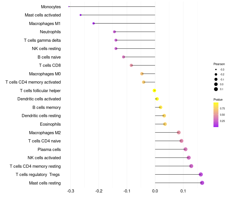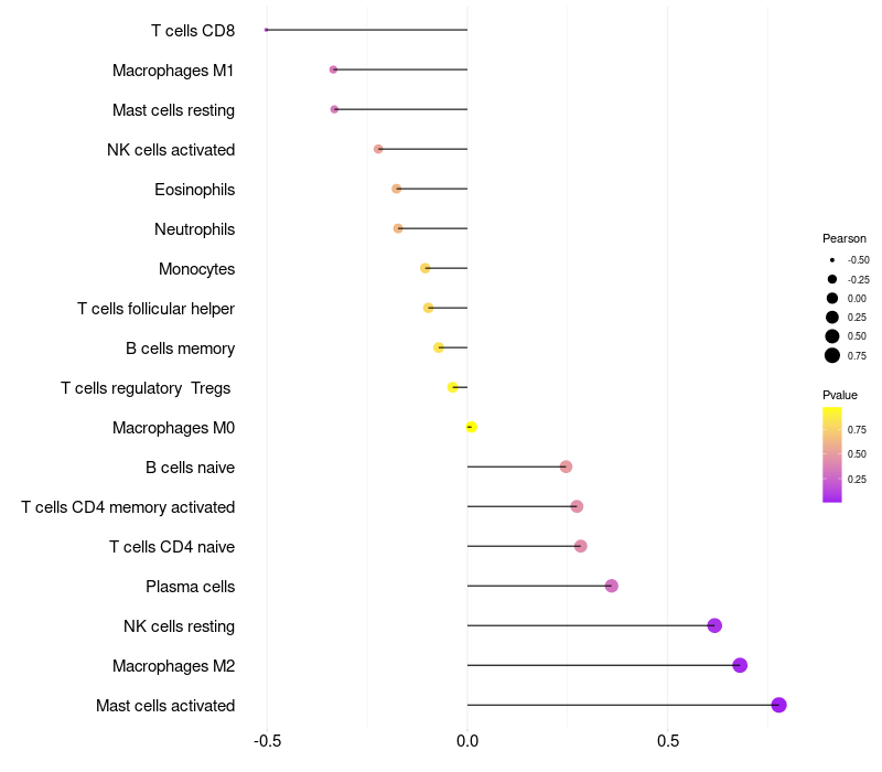 Lollipop of CD34 expression and immune infiltrating cell level correlation result in HBV+ samples