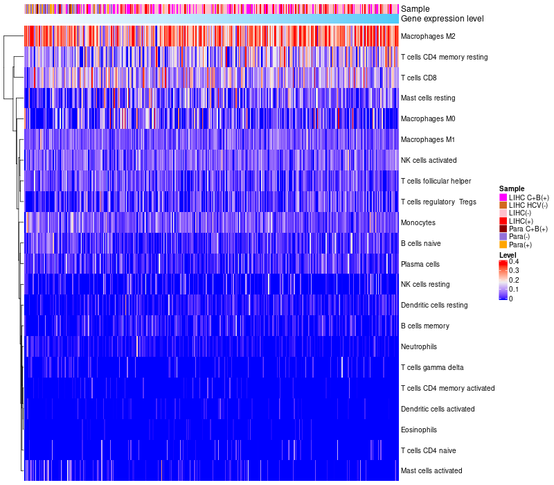 Liver hepatocellular carcinoma HCV (HBV+)(86), Liver hepatocellular carcinoma HCV (HBV-)(19), Liver hepatocellular carcinoma (HBV+)(209), Liver hepatocellular carcinoma (HBV+)(60), Paracancerous HCV (HBV+)(4), Paracancerous (HBV-)(28), Paracancerous (HBV+)(18) |