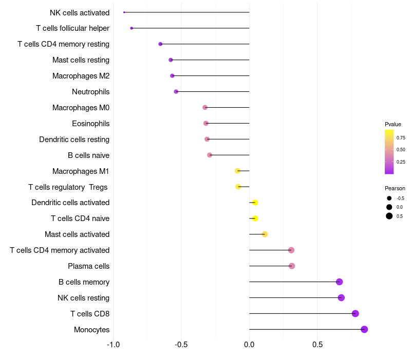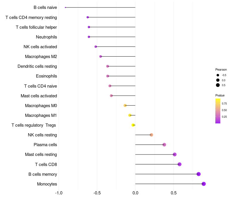 Lollipop of CD36 expression and immune infiltrating cell level correlation result in HBV+ samples