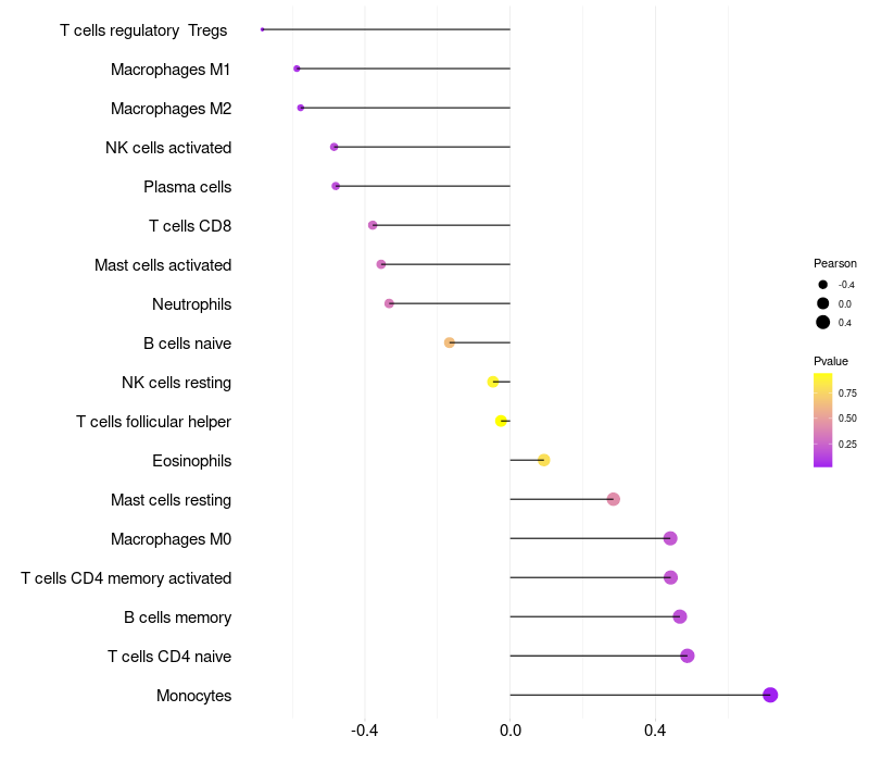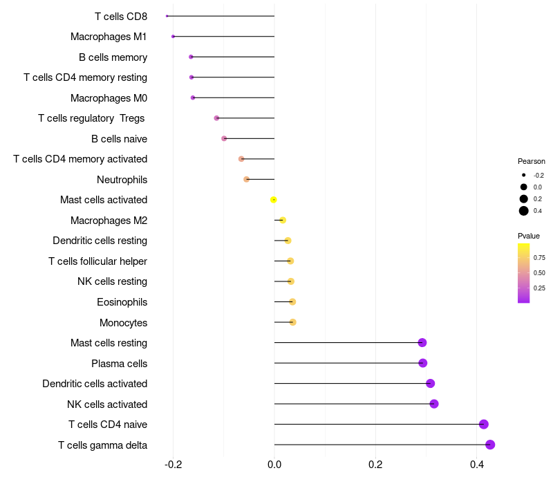 Lollipop of CD36 expression and immune infiltrating cell level correlation result in HBV+ Liver cirrhosis samples