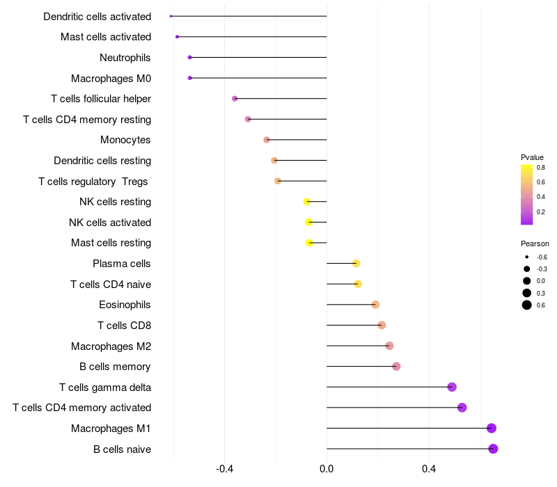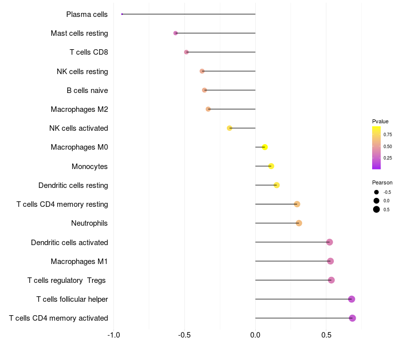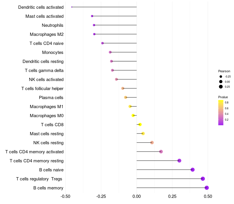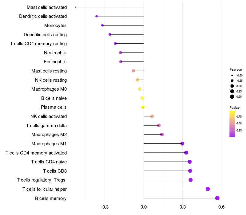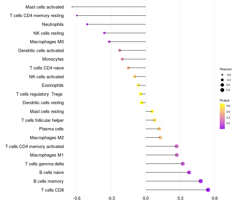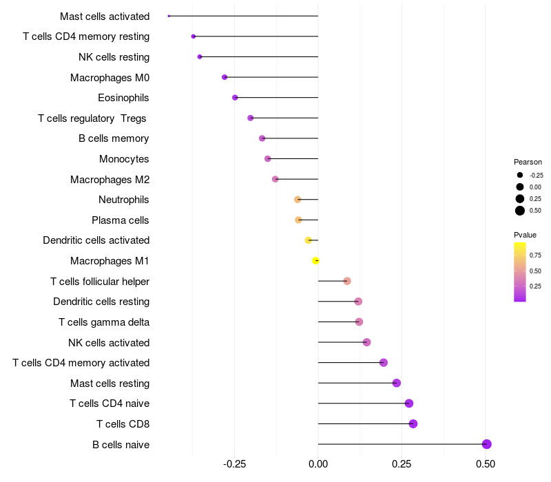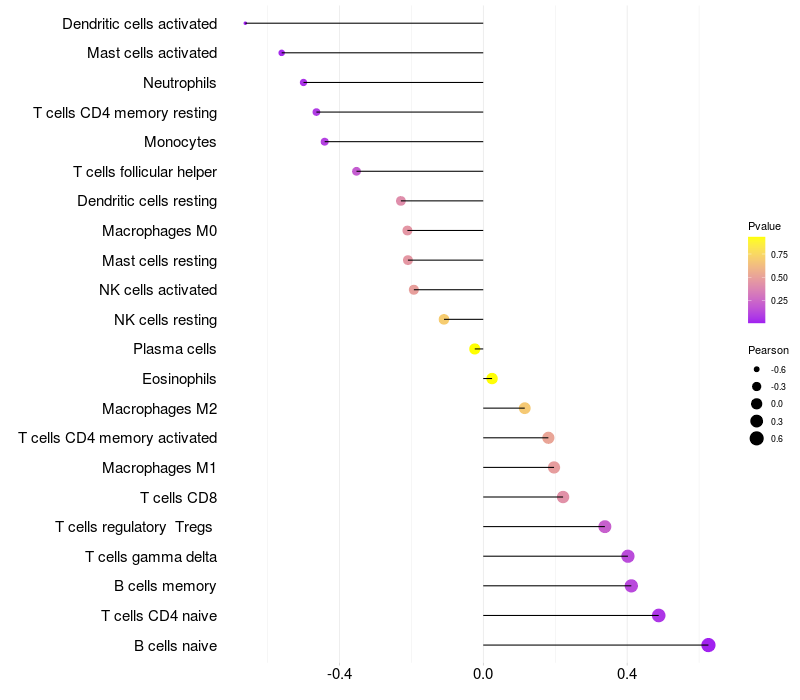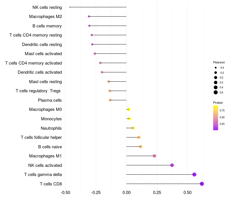 Lollipop of CD5 expression and immune infiltrating cell level correlation result in HPV+ samples