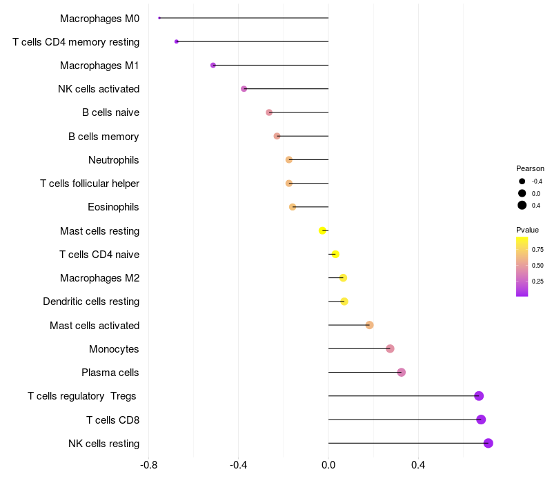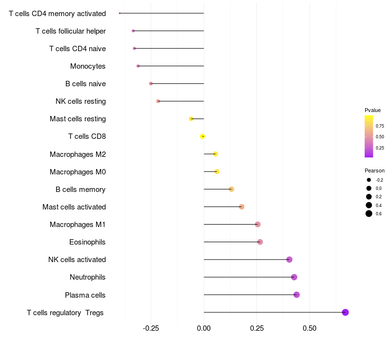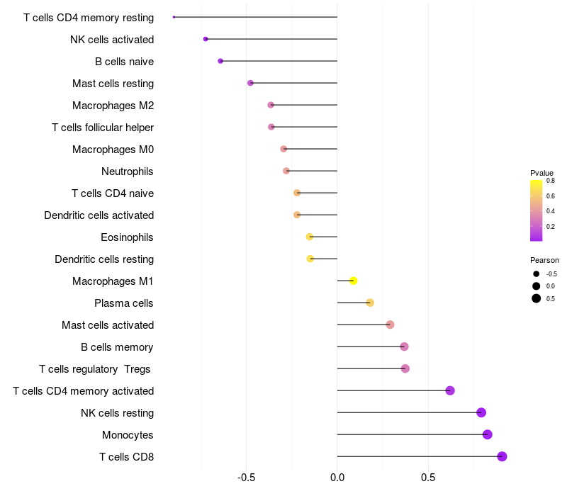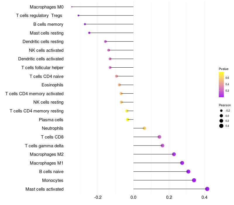 Lollipop of CD5L expression and immune infiltrating cell level correlation result in HBV+ Liver cirrhosis samples