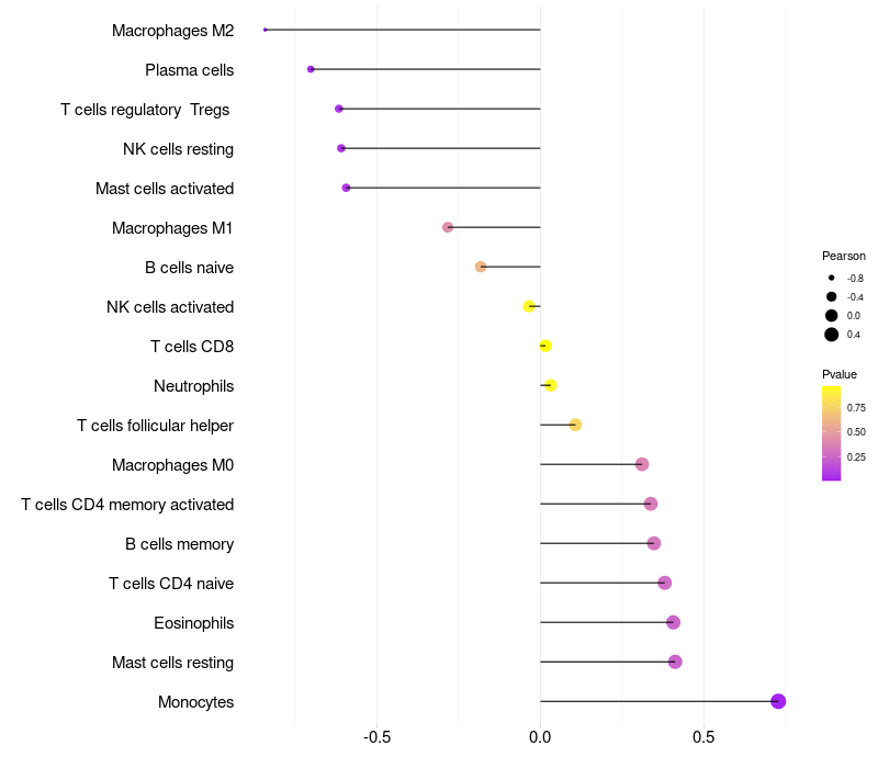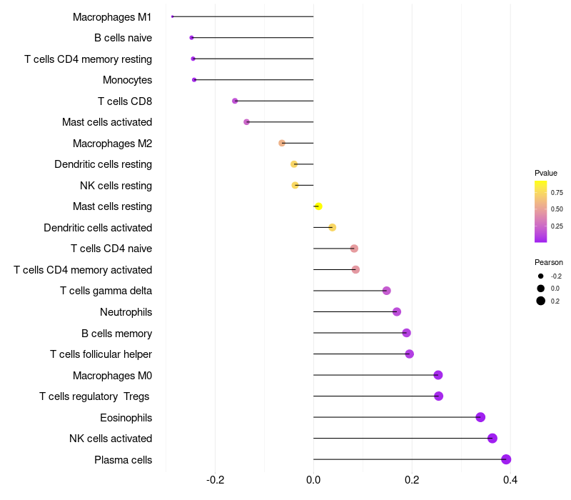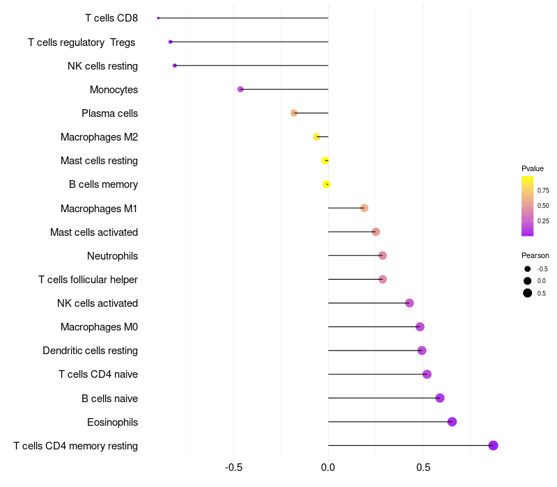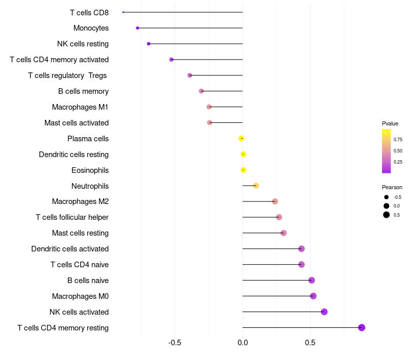 Lollipop of CD63 expression and immune infiltrating cell level correlation result in HBV+ Liver cirrhosis samples