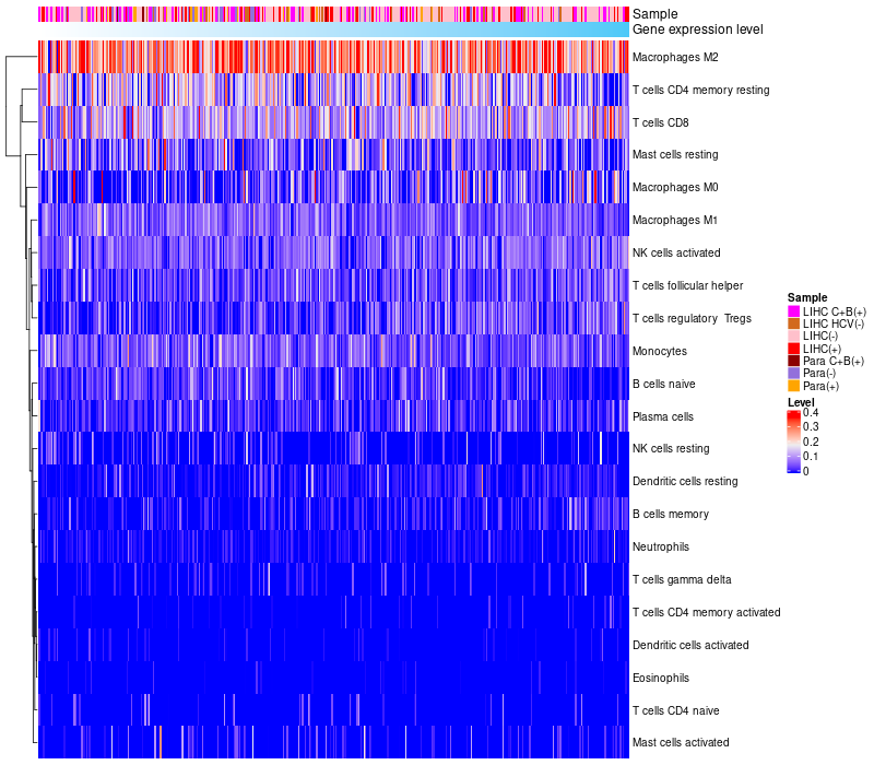 Liver hepatocellular carcinoma HCV (HBV+)(86), Liver hepatocellular carcinoma HCV (HBV-)(19), Liver hepatocellular carcinoma (HBV+)(209), Liver hepatocellular carcinoma (HBV+)(60), Paracancerous HCV (HBV+)(4), Paracancerous (HBV-)(28), Paracancerous (HBV+)(18) |