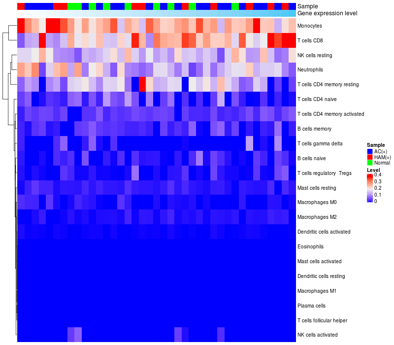 Normal (8), Asymptomatic carriers (HTLV1+)(17), HTLV-1-associated myelopathy (HTLV1+)(10) |