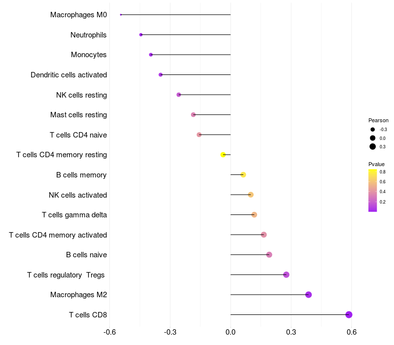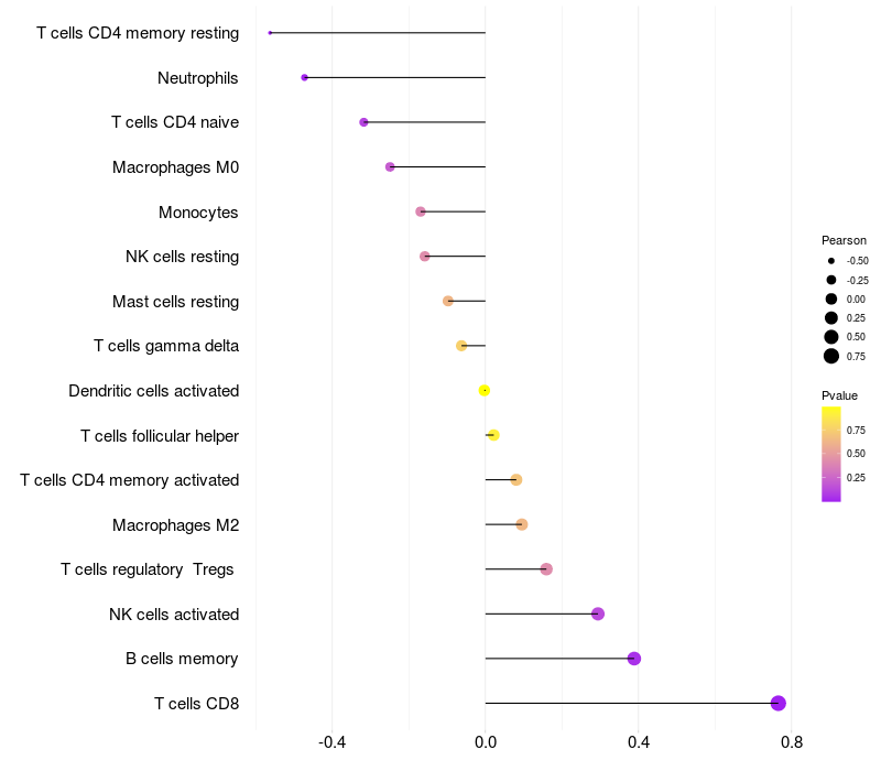 Lollipop of CD81 expression and immune infiltrating cell level correlation result in HTLV1+ samples