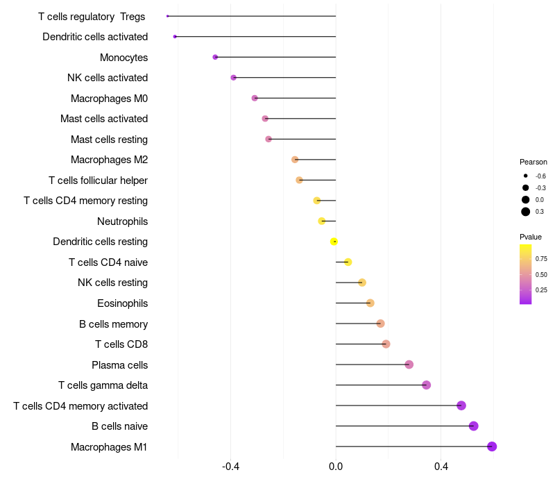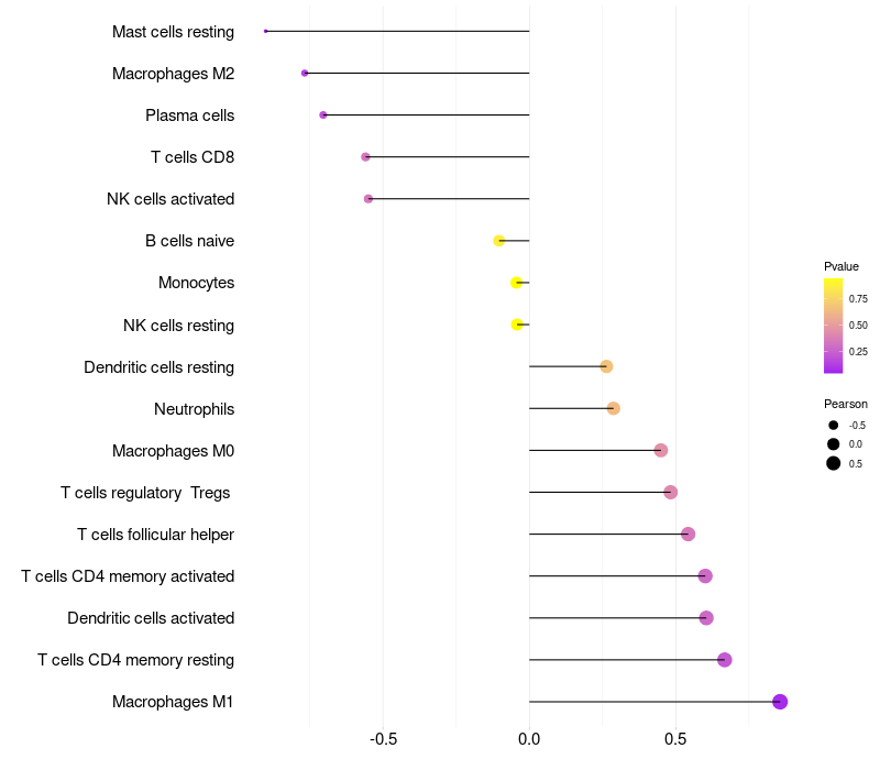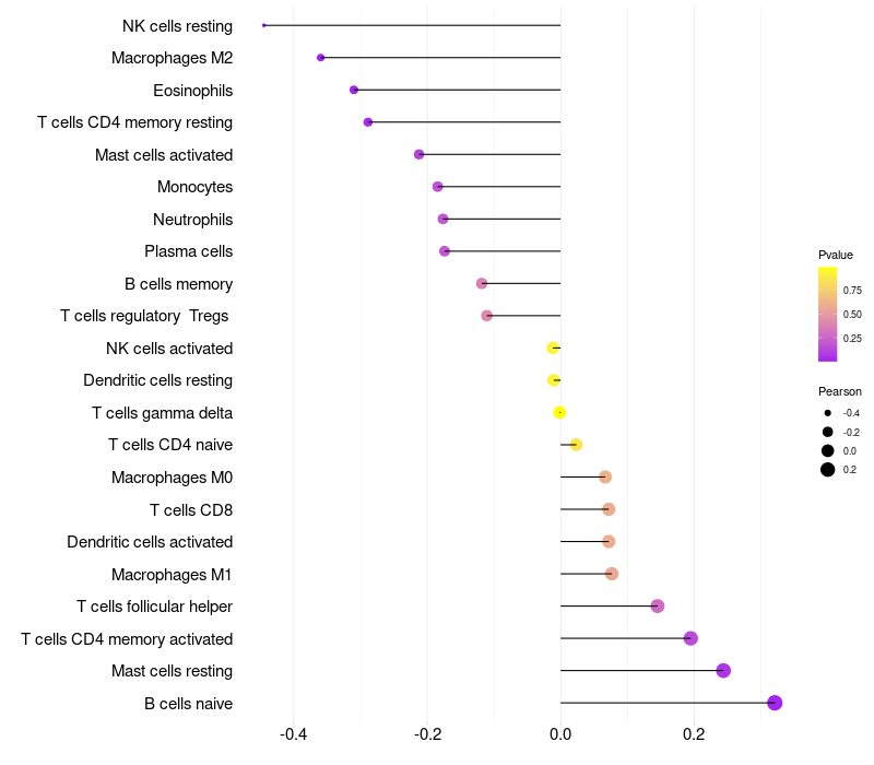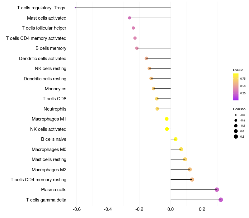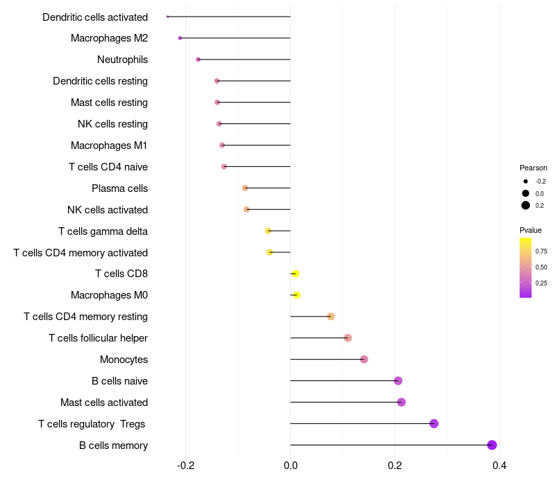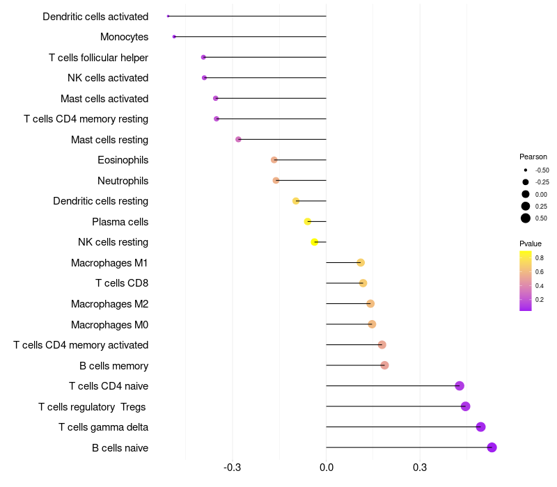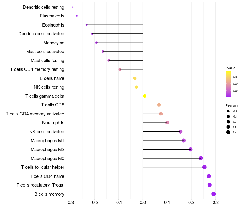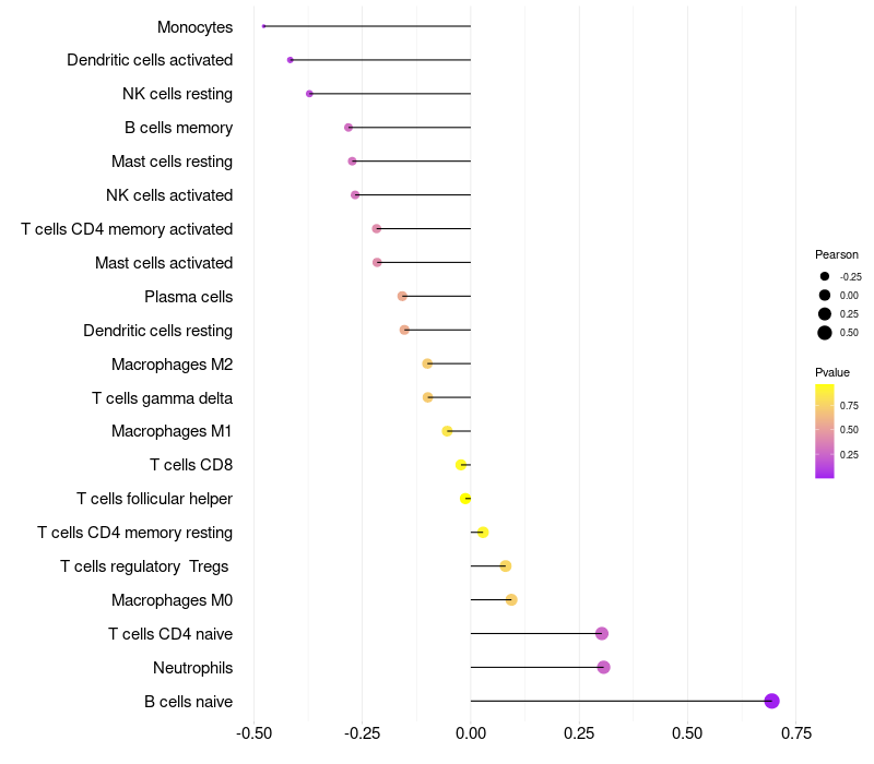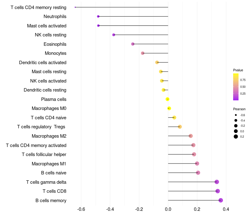 Lollipop of CD83 expression and immune infiltrating cell level correlation result in HPV+ samples