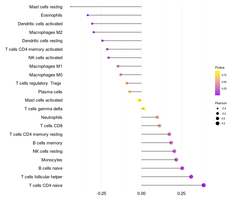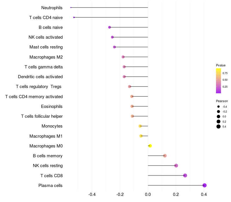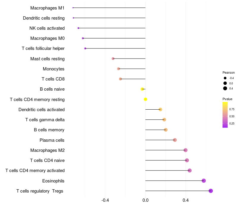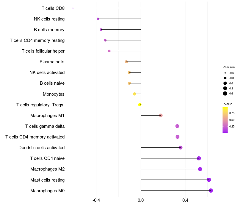 Lollipop of CD99L2 expression and immune infiltrating cell level correlation result in EBV+ samples