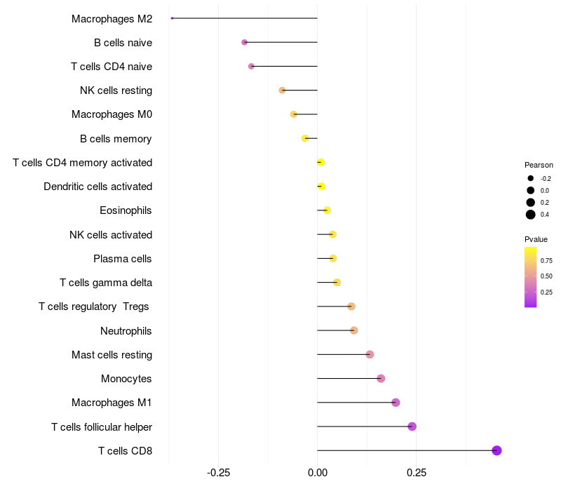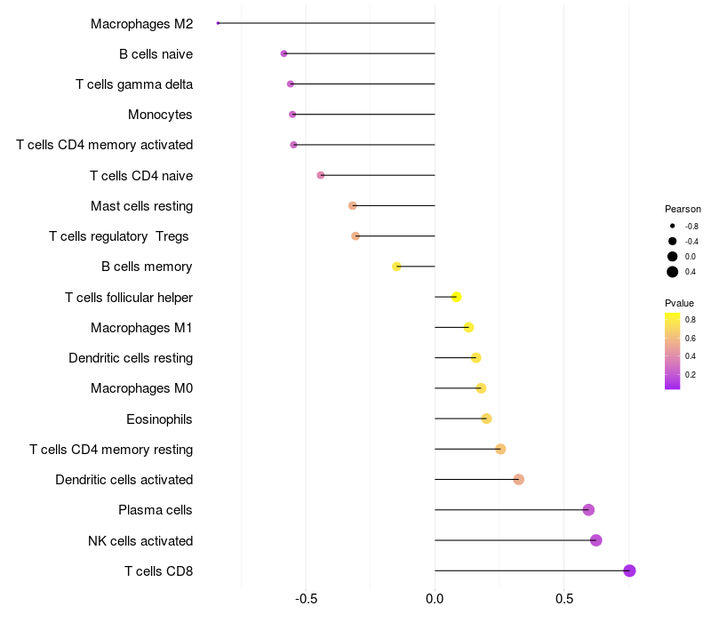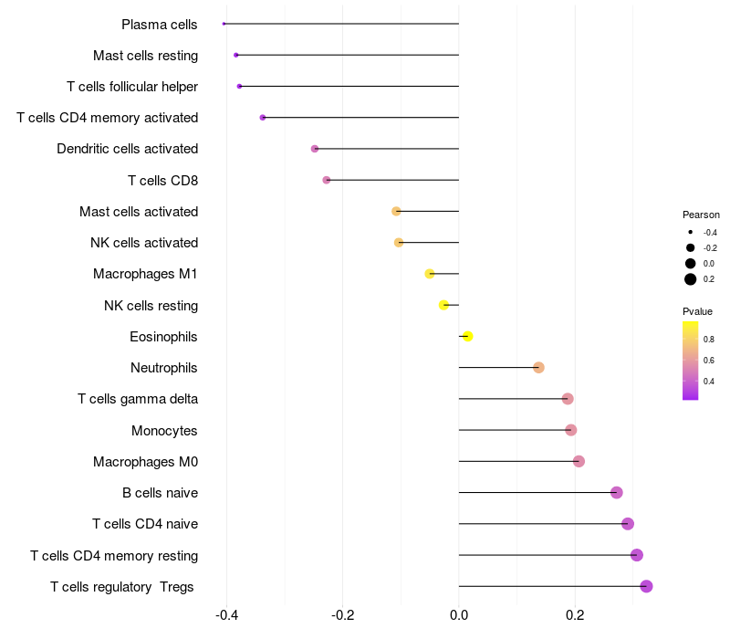 Lollipop of CDH13 expression and immune infiltrating cell level correlation result in EBV+ samples