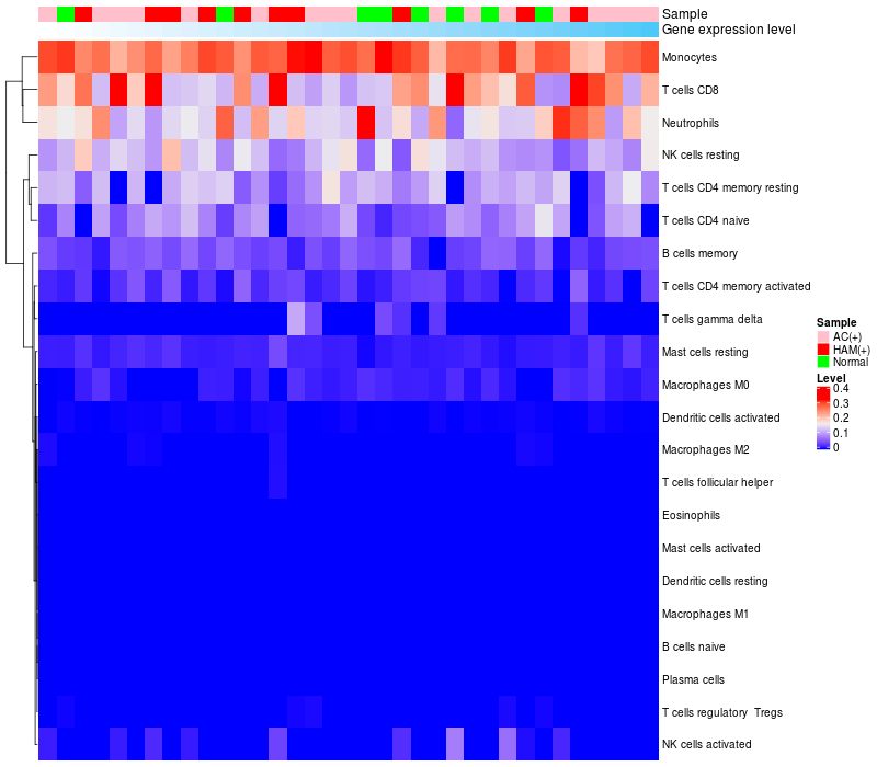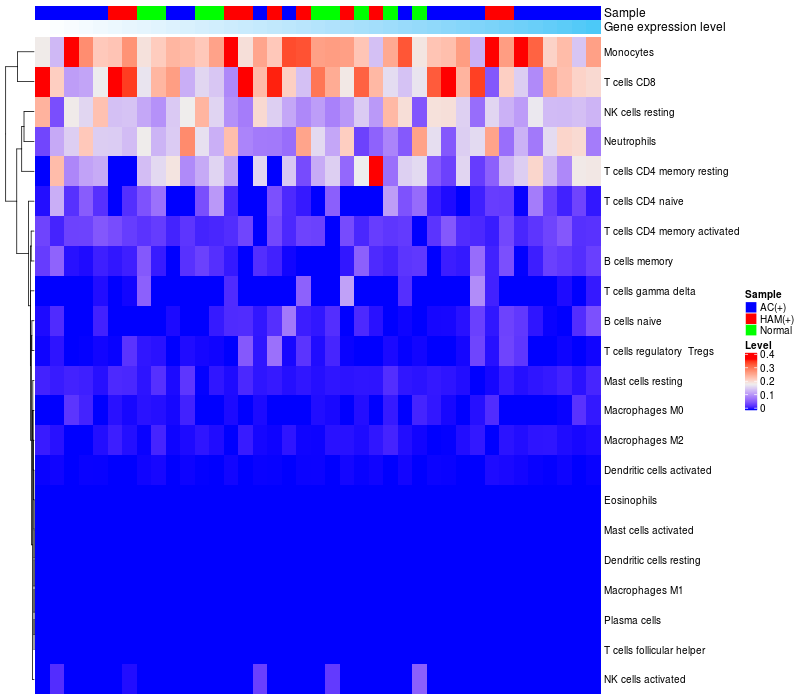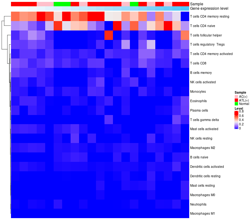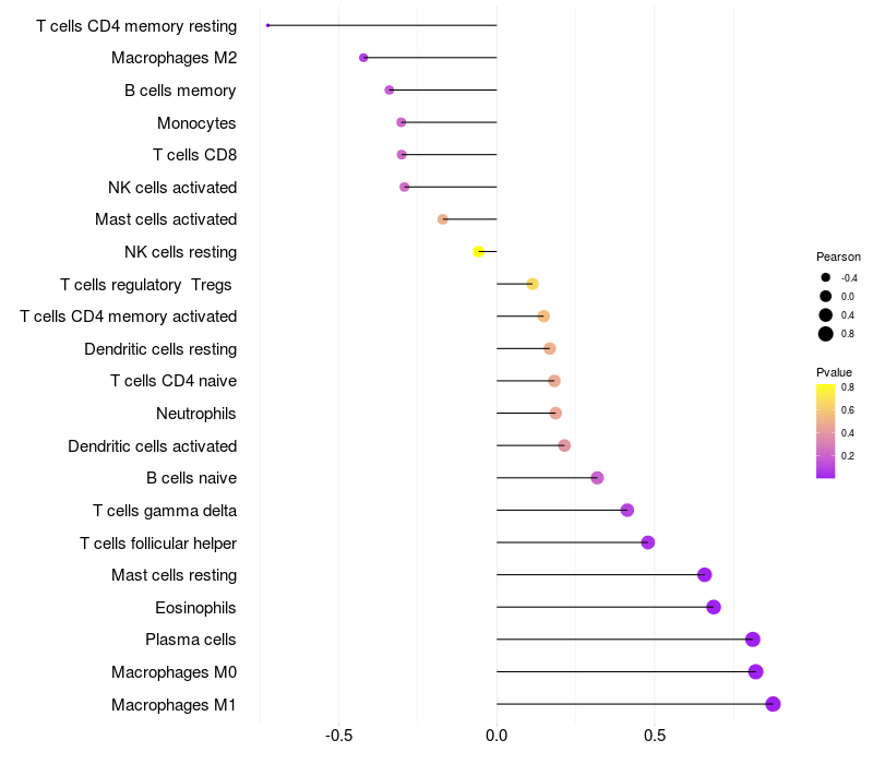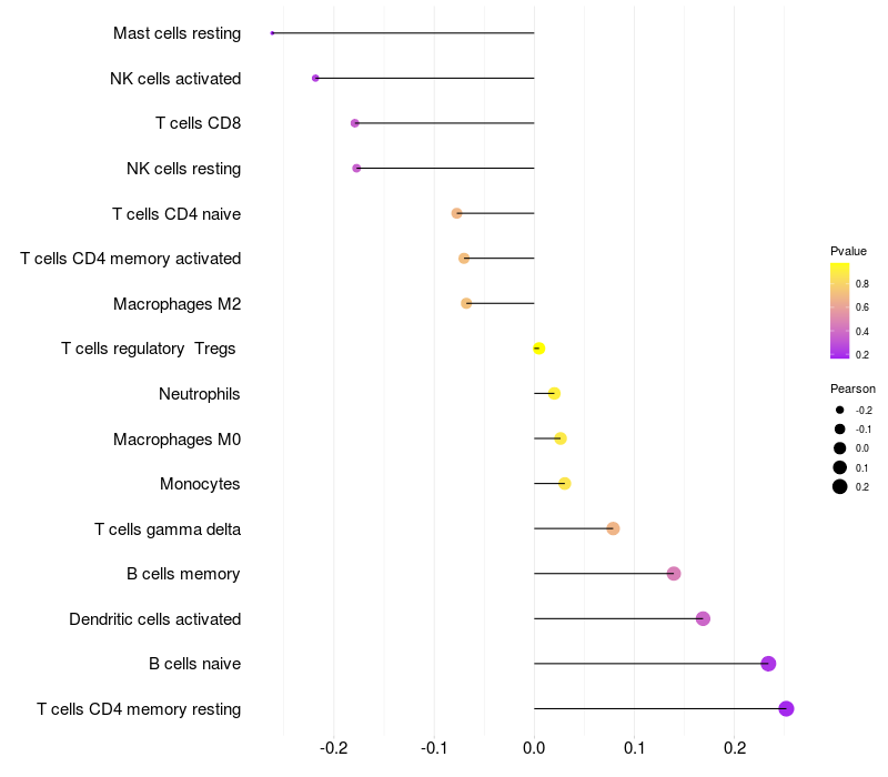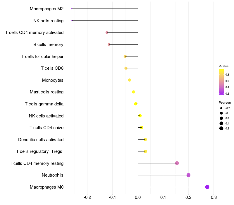 Lollipop of CDH20 expression and immune infiltrating cell level correlation result in HTLV1+ samples