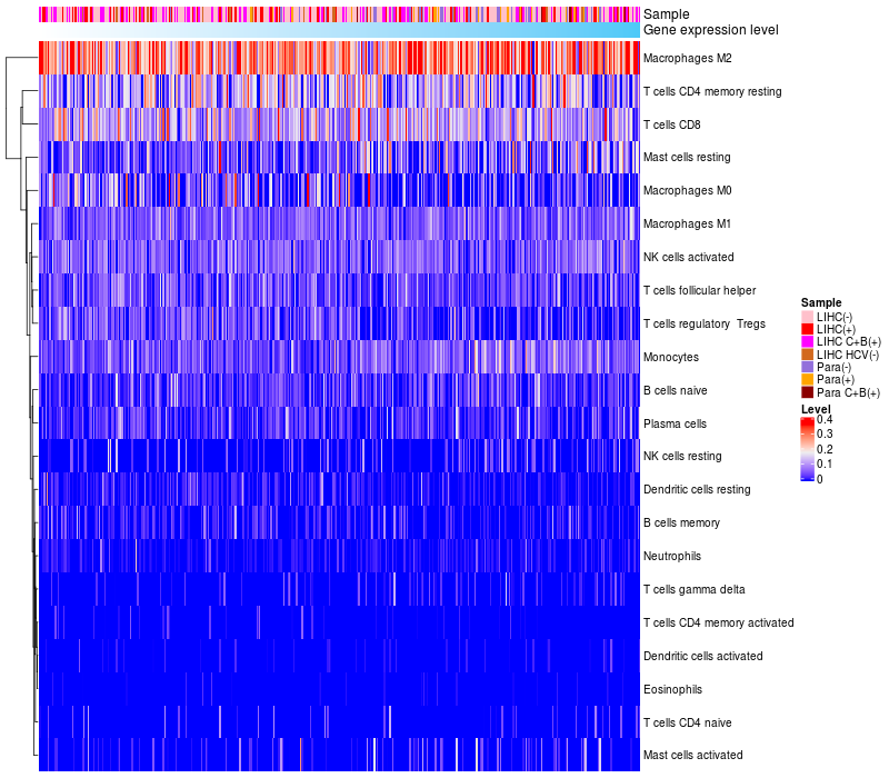 Liver hepatocellular carcinoma HCV (HBV+)(86), Liver hepatocellular carcinoma HCV (HBV-)(19), Liver hepatocellular carcinoma (HBV+)(209), Liver hepatocellular carcinoma (HBV+)(60), Paracancerous HCV (HBV+)(4), Paracancerous (HBV-)(28), Paracancerous (HBV+)(18) |