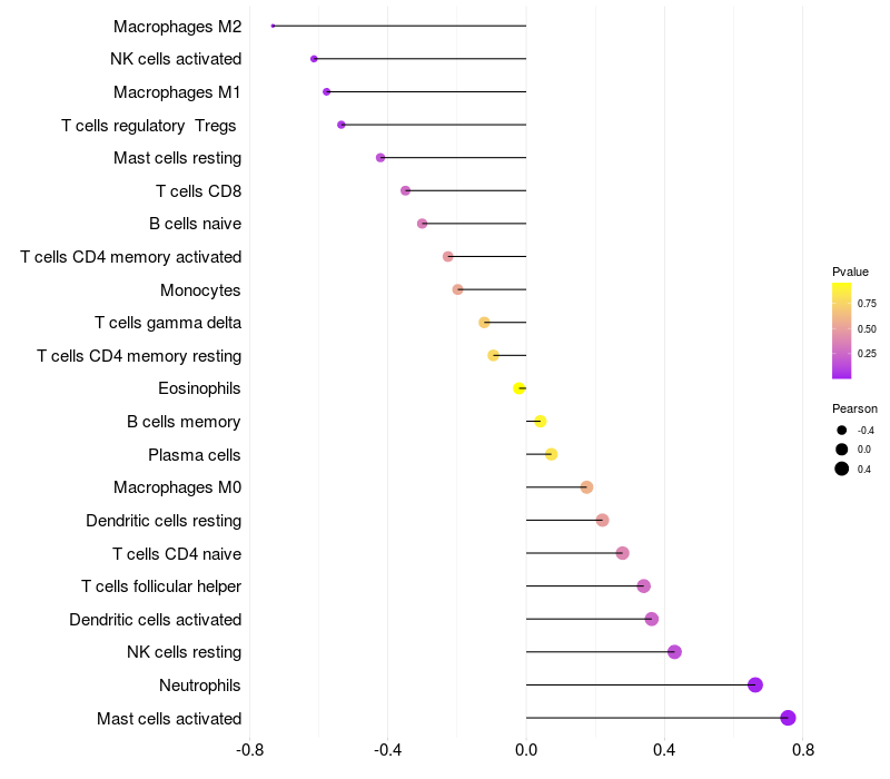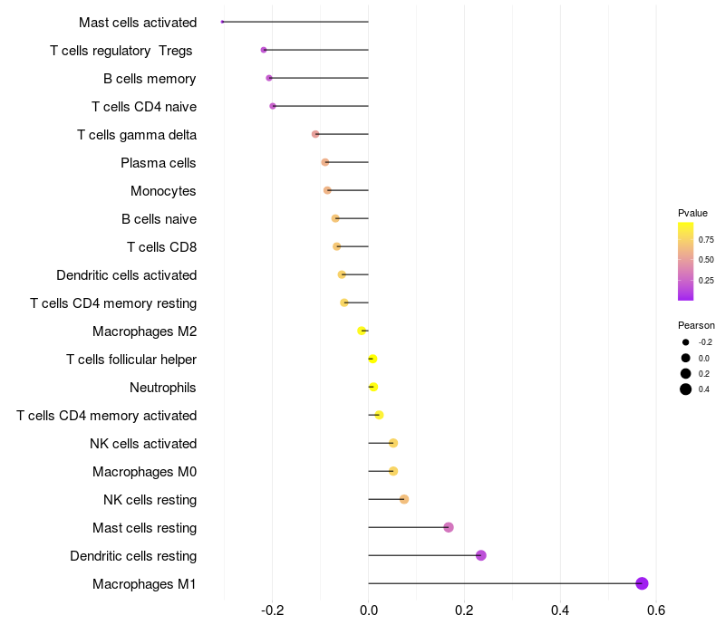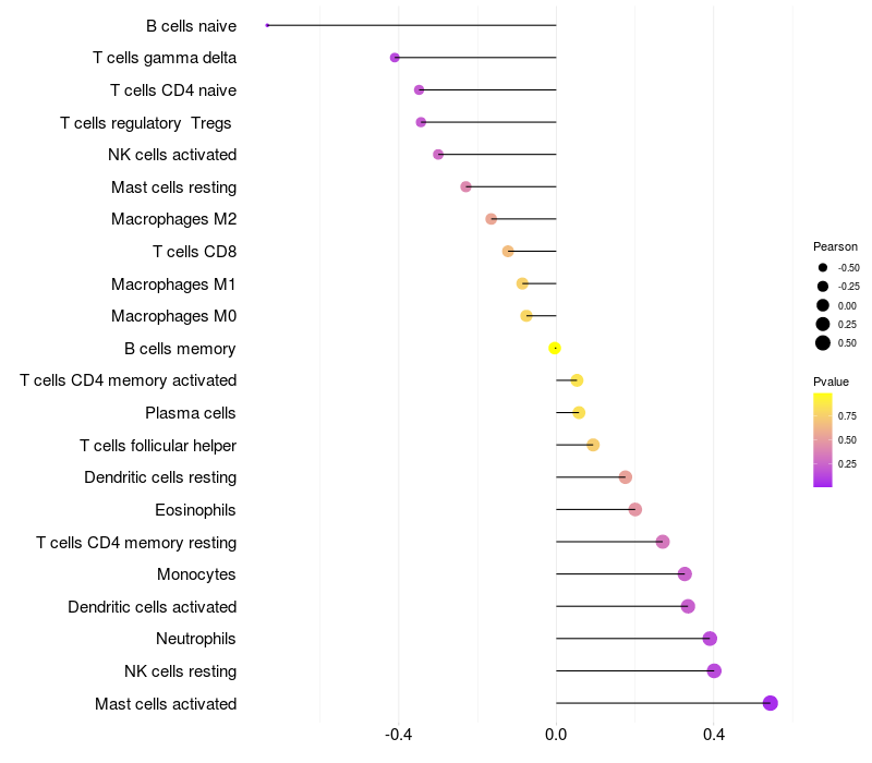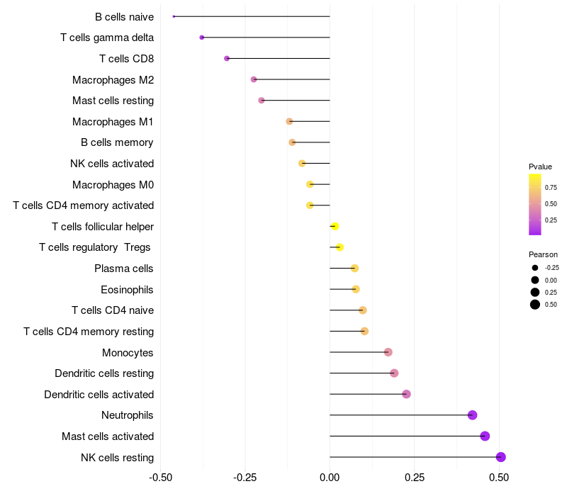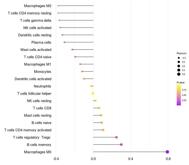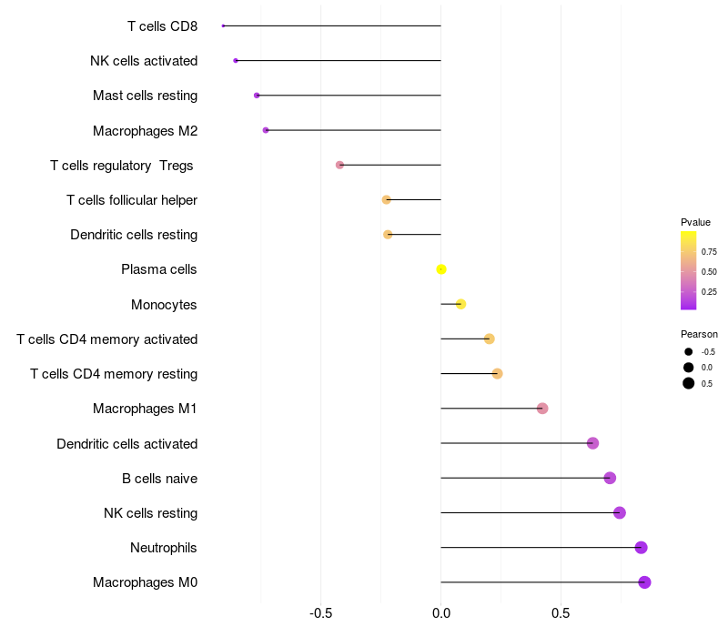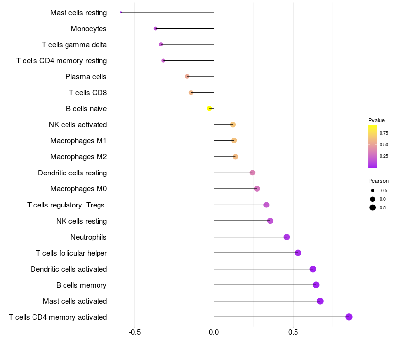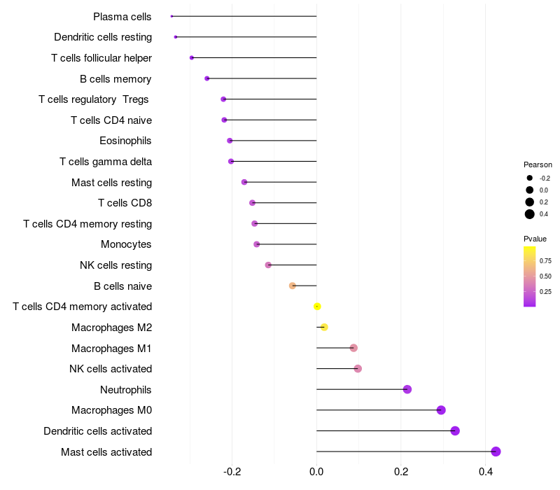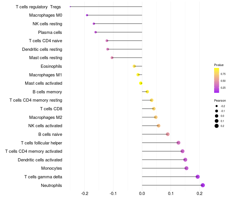 Lollipop of CDH3 expression and immune infiltrating cell level correlation result in HPV+ samples