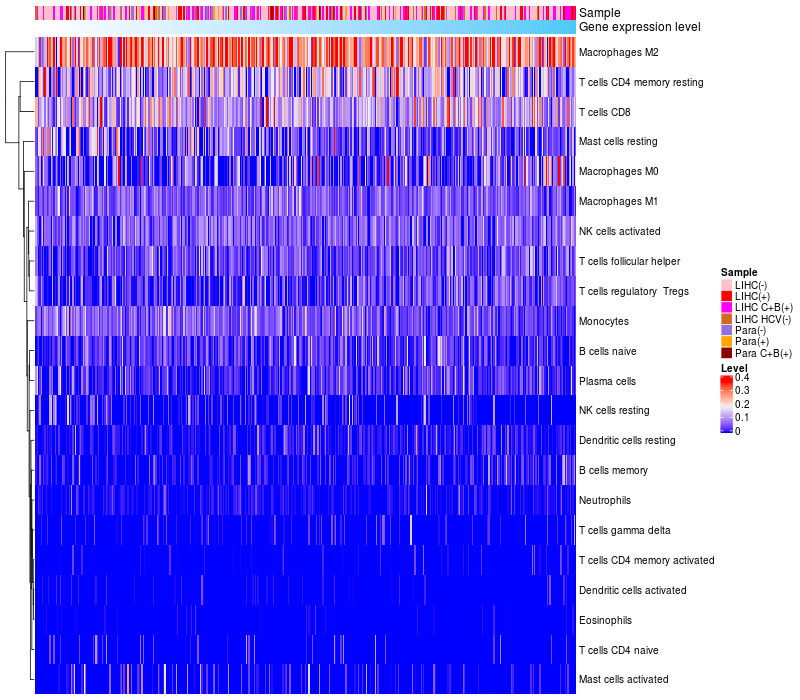 Liver hepatocellular carcinoma HCV (HBV+)(86), Liver hepatocellular carcinoma HCV (HBV-)(19), Liver hepatocellular carcinoma (HBV+)(209), Liver hepatocellular carcinoma (HBV+)(60), Paracancerous HCV (HBV+)(4), Paracancerous (HBV-)(28), Paracancerous (HBV+)(18) |