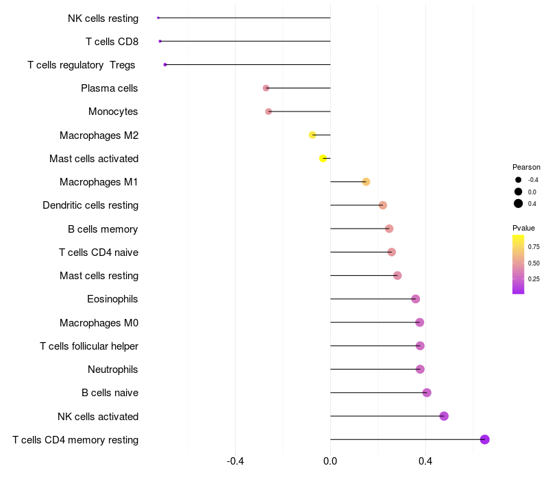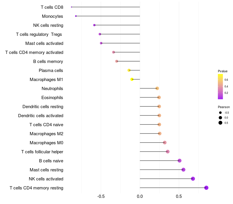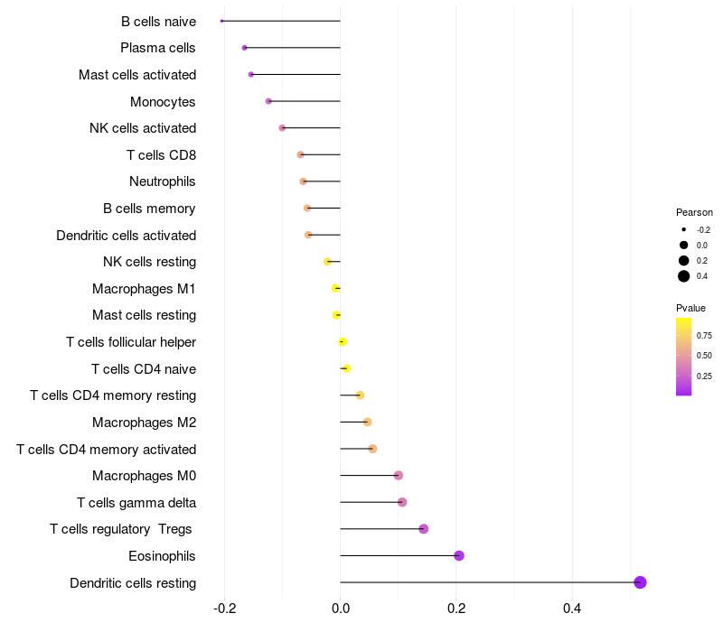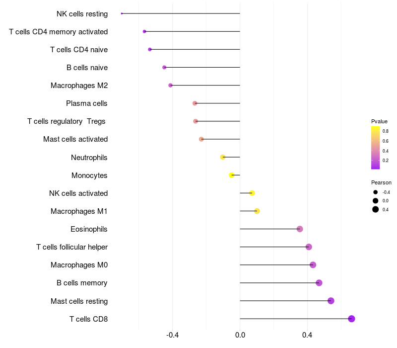 Lollipop of CDK5RAP2 expression and immune infiltrating cell level correlation result in HBV+ Liver cirrhosis samples