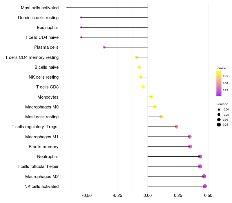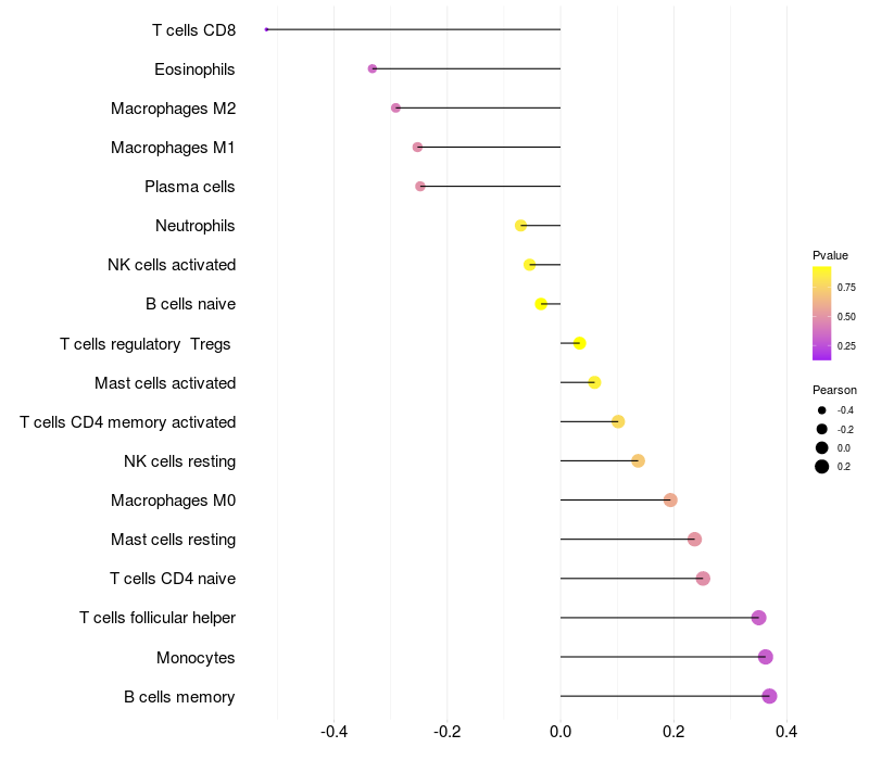 Lollipop of CDKAL1 expression and immune infiltrating cell level correlation result in HBV+ Chronic HBV (CHB) infection samples