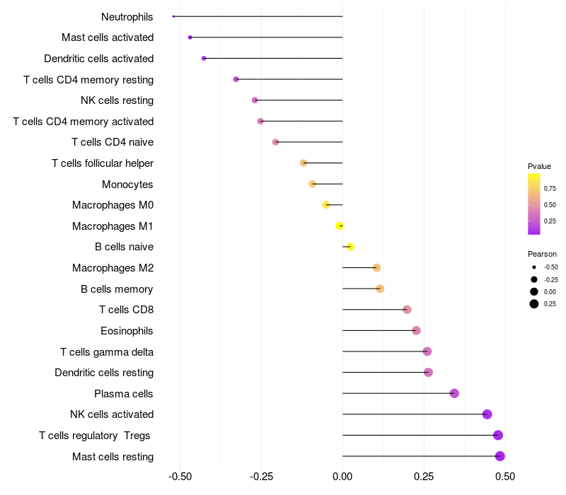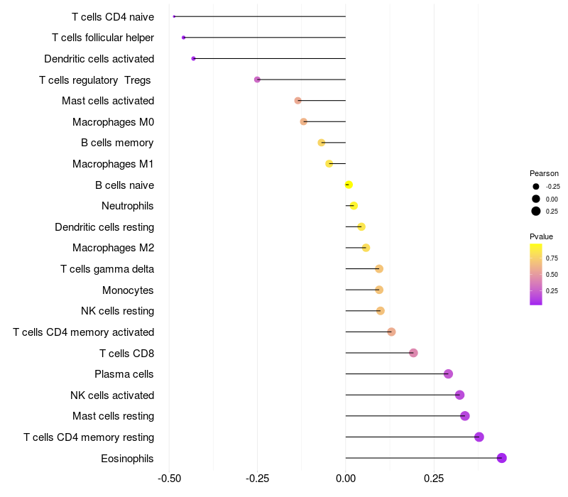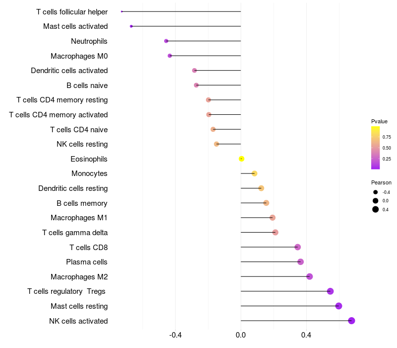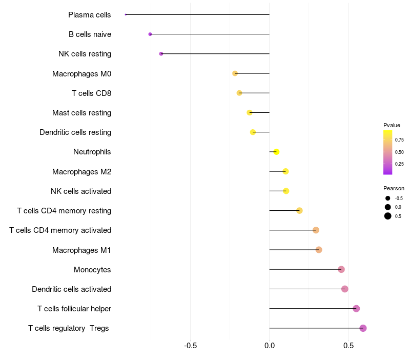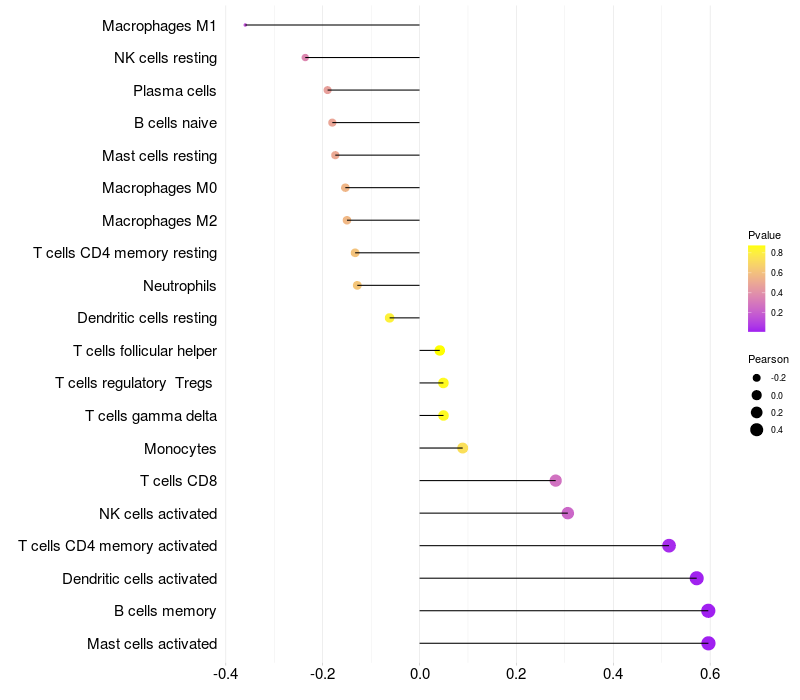 Lollipop of CDRT15L2 expression and immune infiltrating cell level correlation result in HPV+ samples
