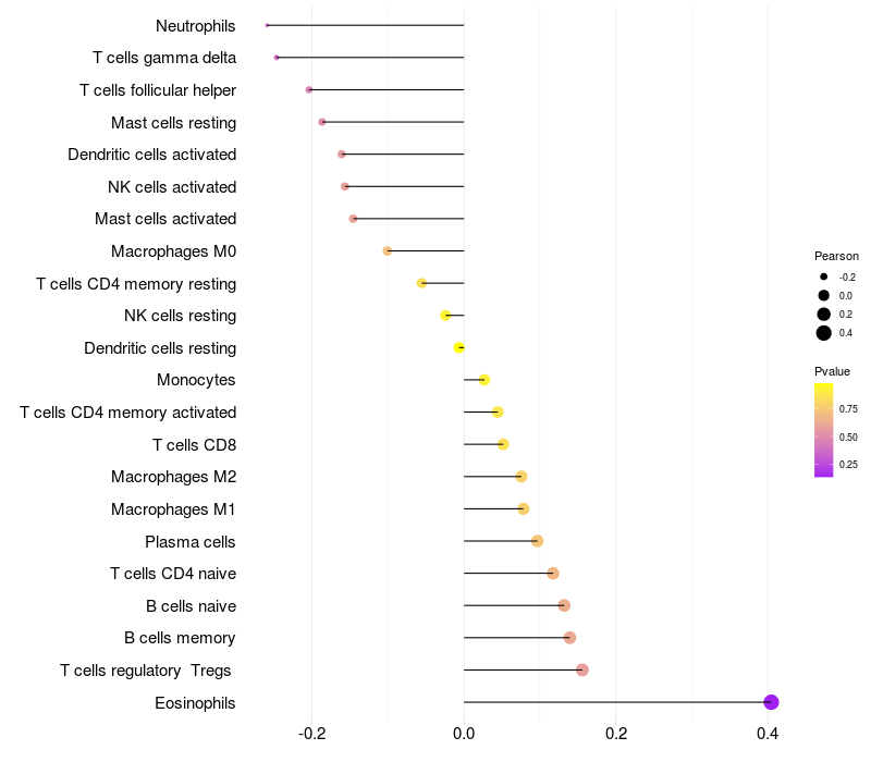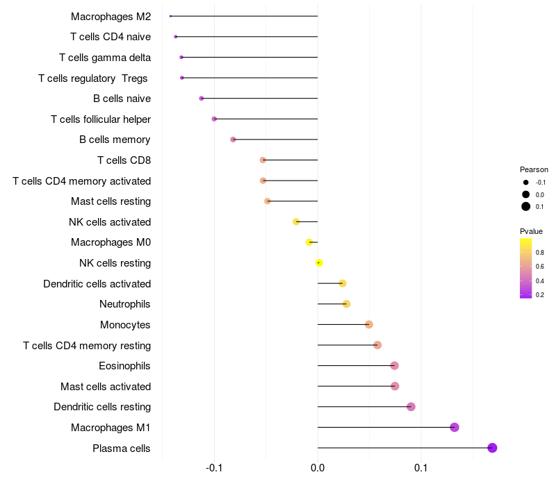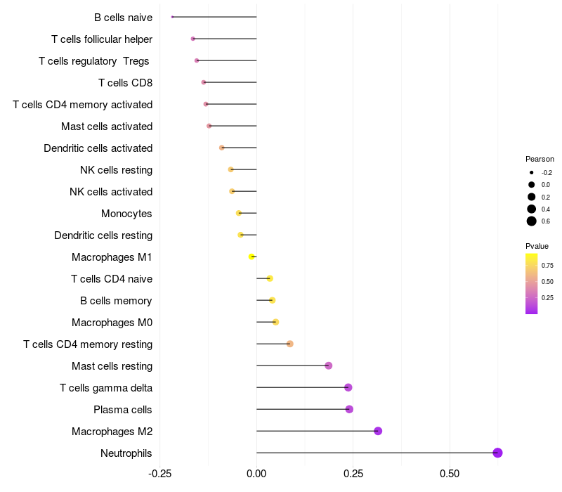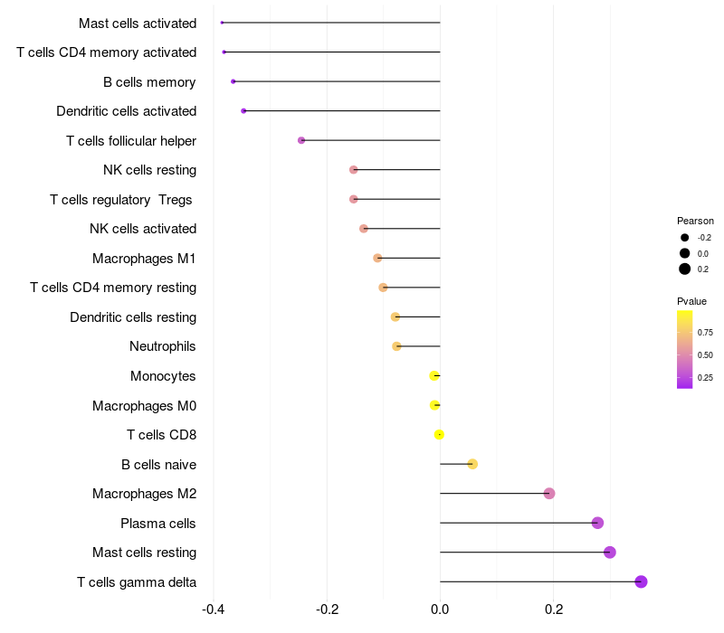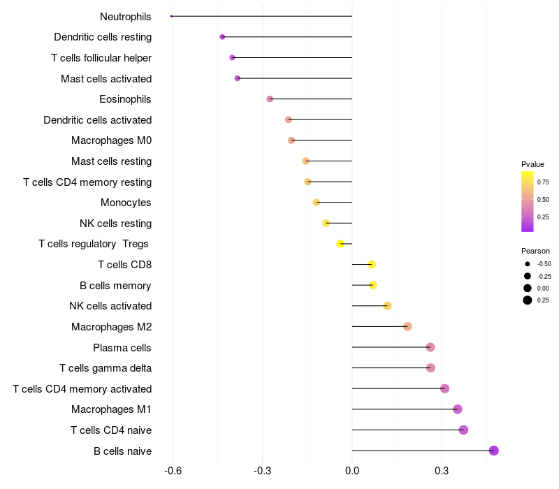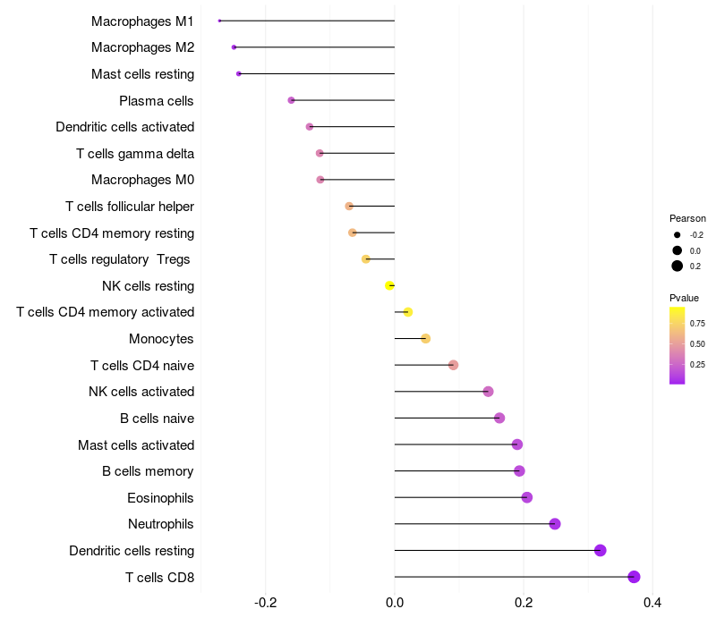 Lollipop of CEACAM19 expression and immune infiltrating cell level correlation result in HPV+ samples