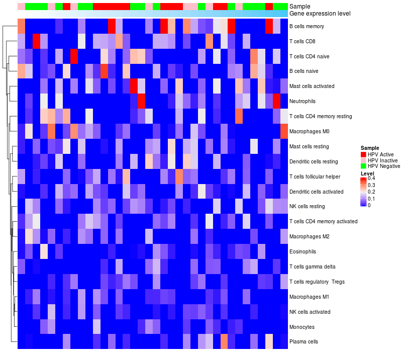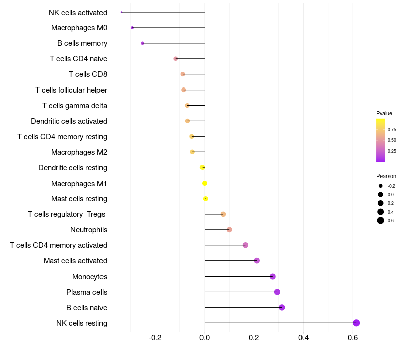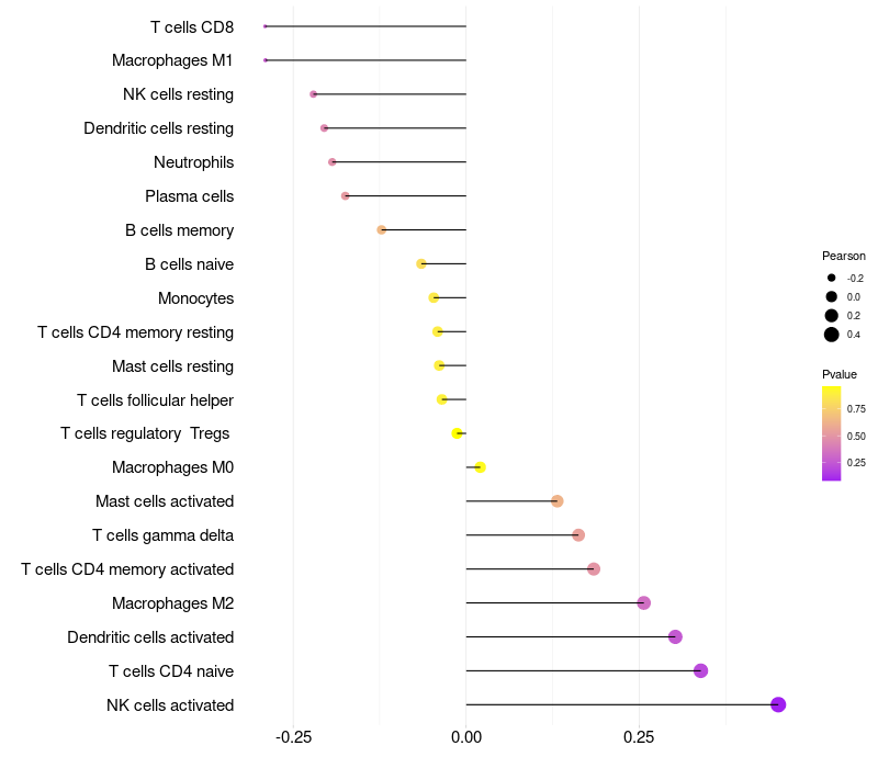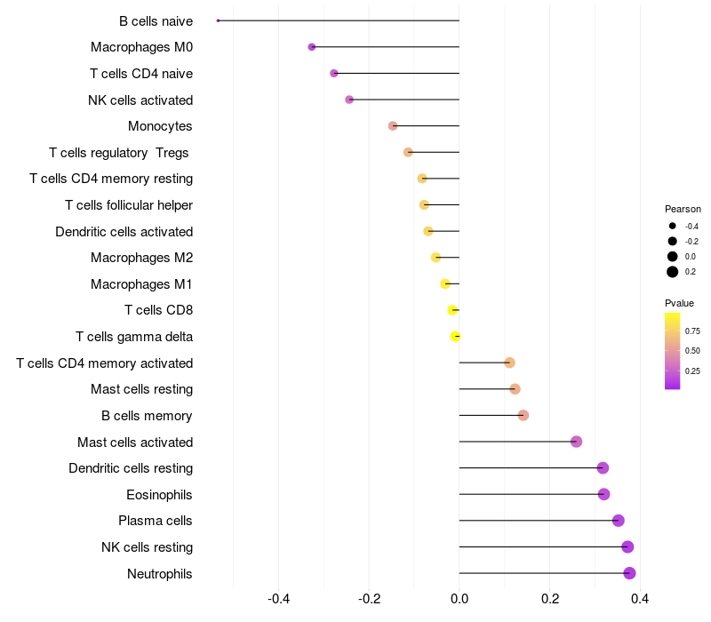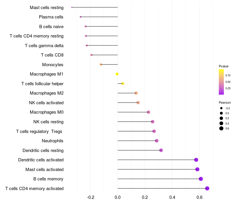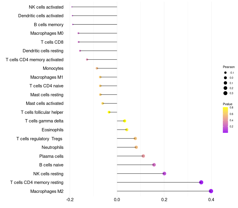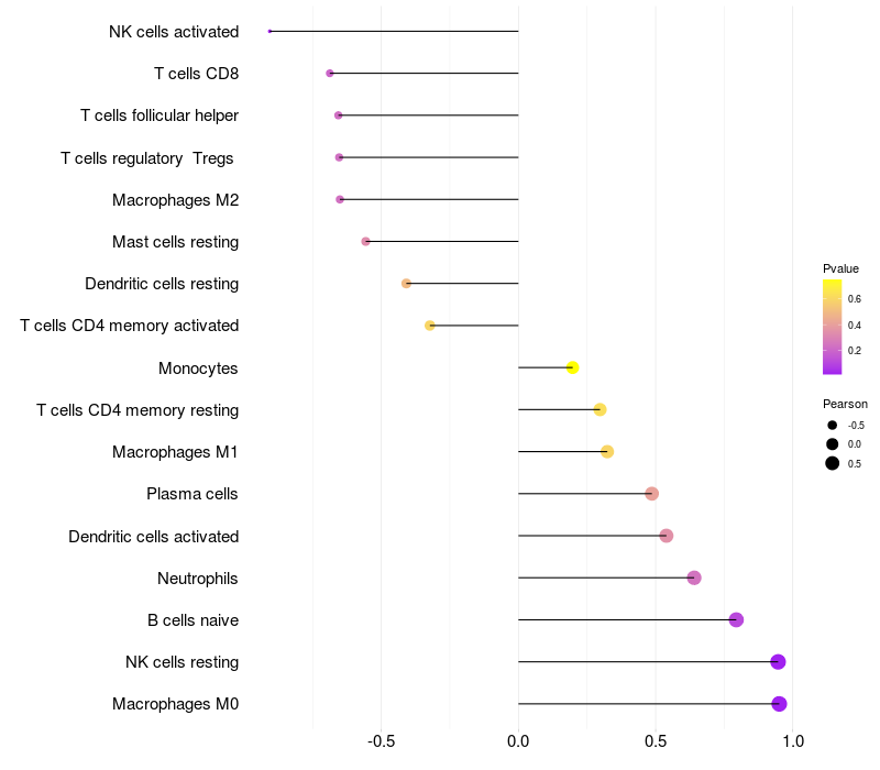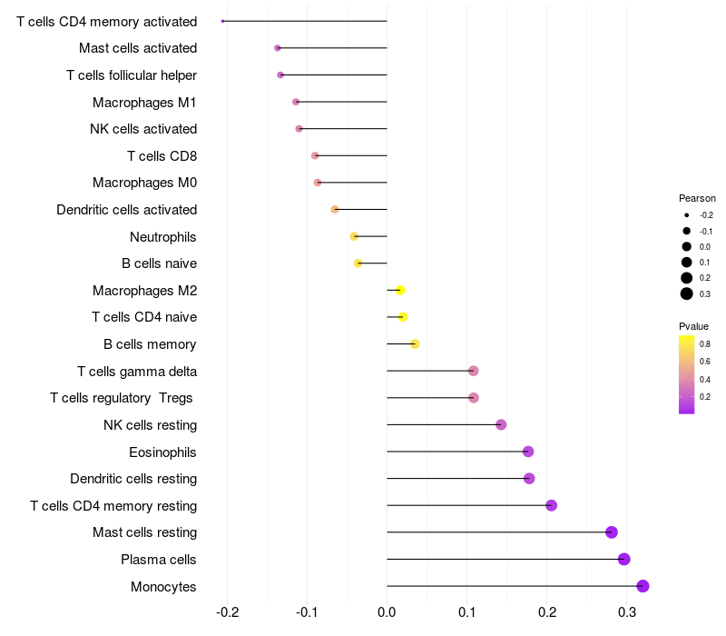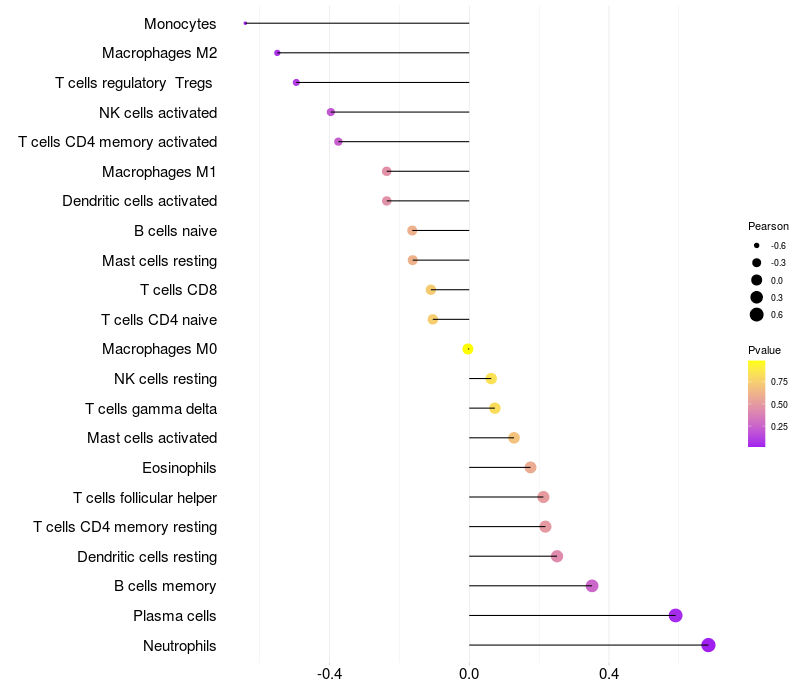 Lollipop of CEACAM6 expression and immune infiltrating cell level correlation result in HPV+ samples