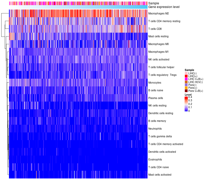 Liver hepatocellular carcinoma HCV (HBV+)(86), Liver hepatocellular carcinoma HCV (HBV-)(19), Liver hepatocellular carcinoma (HBV+)(209), Liver hepatocellular carcinoma (HBV+)(60), Paracancerous HCV (HBV+)(4), Paracancerous (HBV-)(28), Paracancerous (HBV+)(18) |