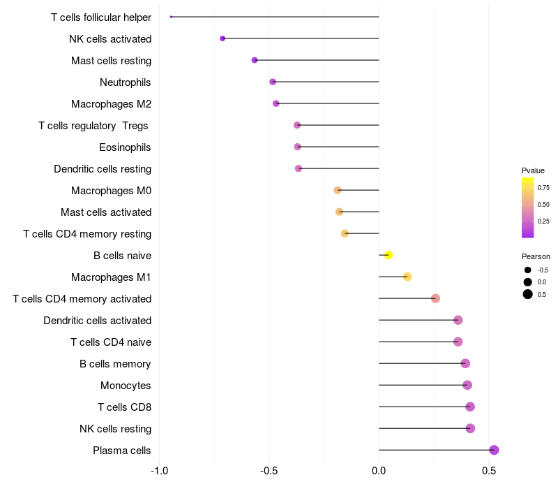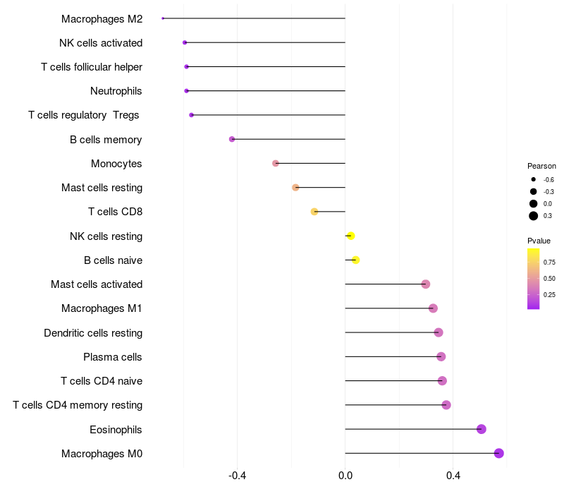 Lollipop of CES1 expression and immune infiltrating cell level correlation result in HBV+ Liver cirrhosis samples