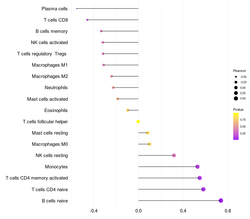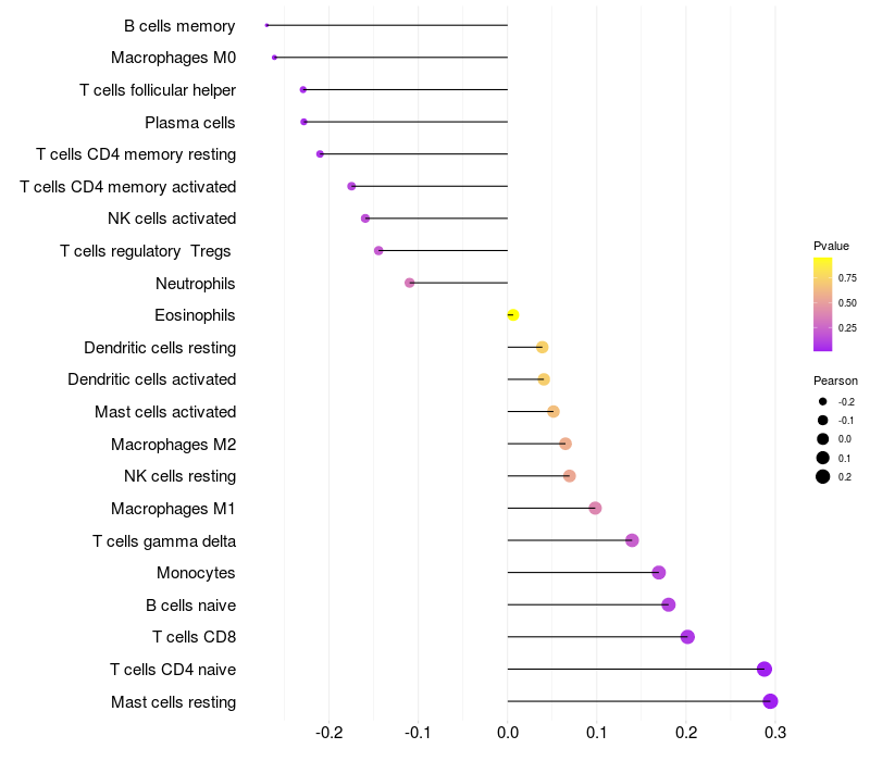 Lollipop of CES1 expression and immune infiltrating cell level correlation result in HBV+ Hepatocellular carcinoma samples