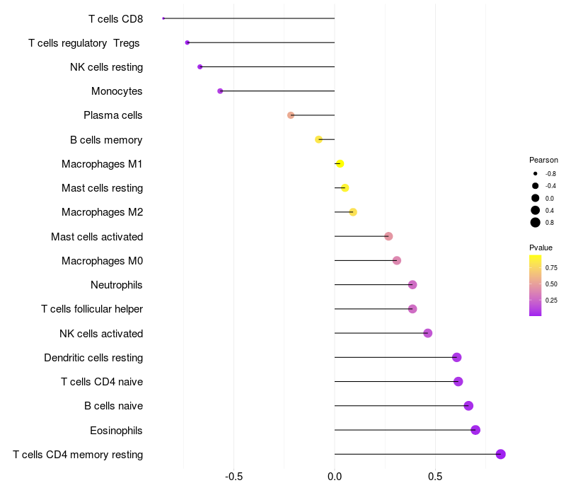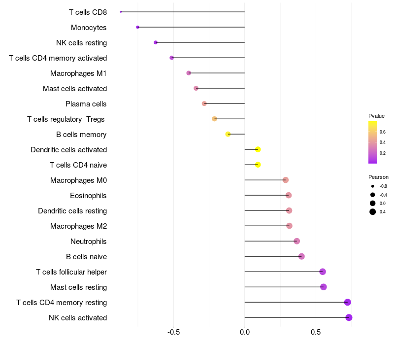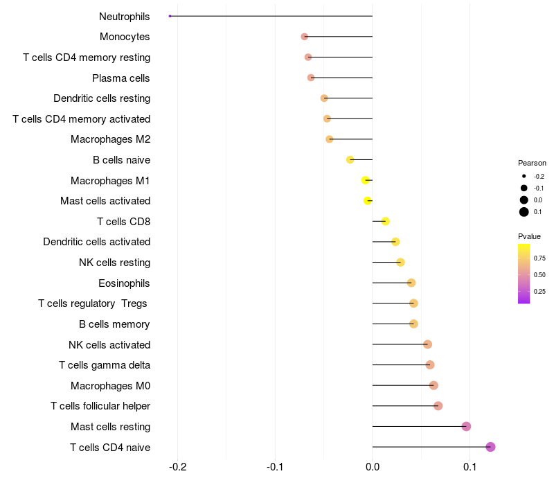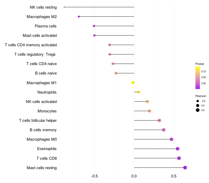 Lollipop of CFDP1 expression and immune infiltrating cell level correlation result in HBV+ Liver cirrhosis samples