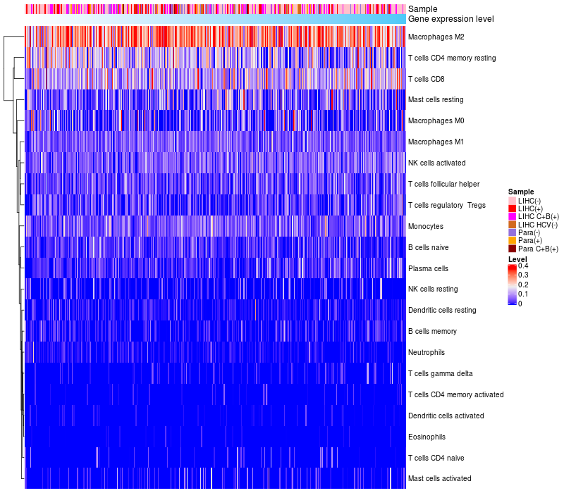 Liver hepatocellular carcinoma HCV (HBV+)(86), Liver hepatocellular carcinoma HCV (HBV-)(19), Liver hepatocellular carcinoma (HBV+)(209), Liver hepatocellular carcinoma (HBV+)(60), Paracancerous HCV (HBV+)(4), Paracancerous (HBV-)(28), Paracancerous (HBV+)(18) |