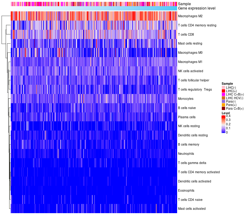 Liver hepatocellular carcinoma HCV (HBV+)(86), Liver hepatocellular carcinoma HCV (HBV-)(19), Liver hepatocellular carcinoma (HBV+)(209), Liver hepatocellular carcinoma (HBV+)(60), Paracancerous HCV (HBV+)(4), Paracancerous (HBV-)(28), Paracancerous (HBV+)(18) |