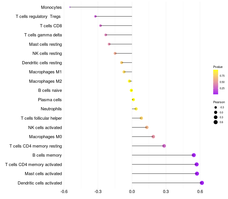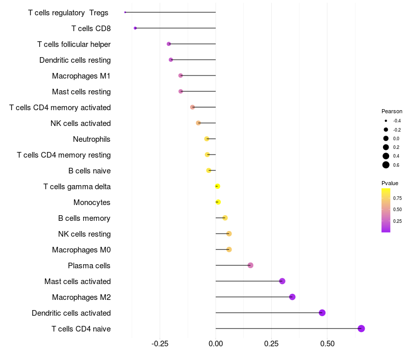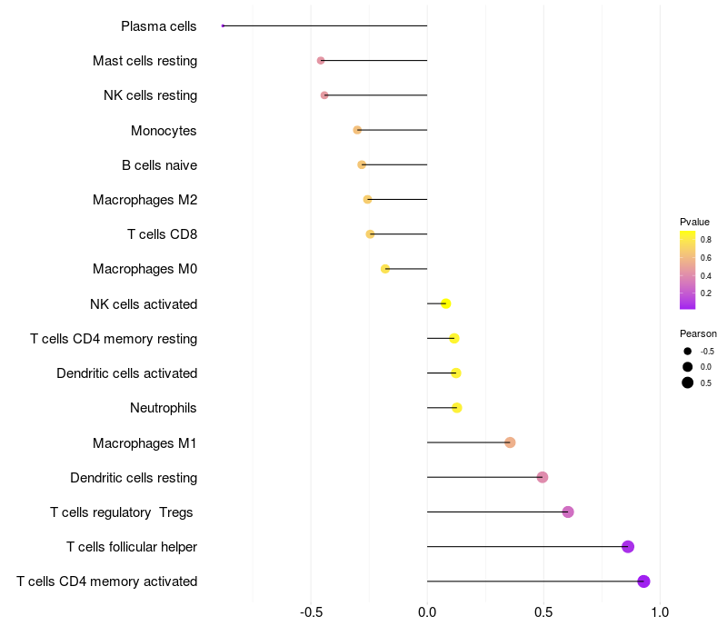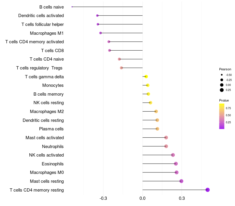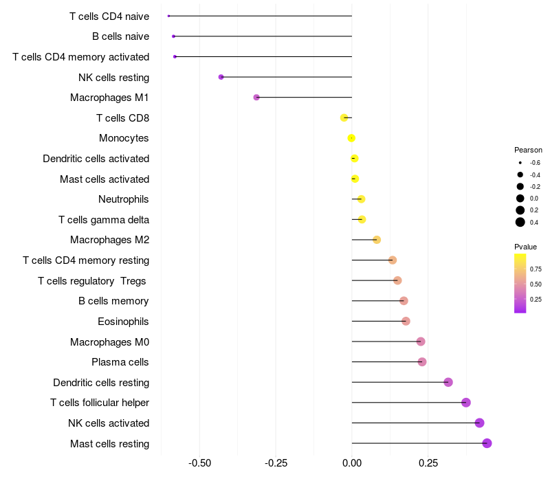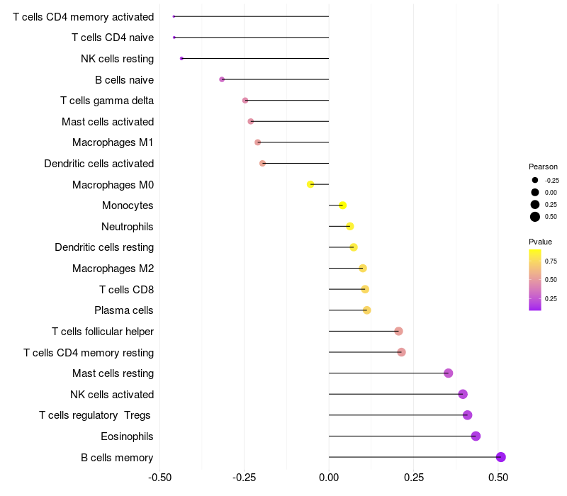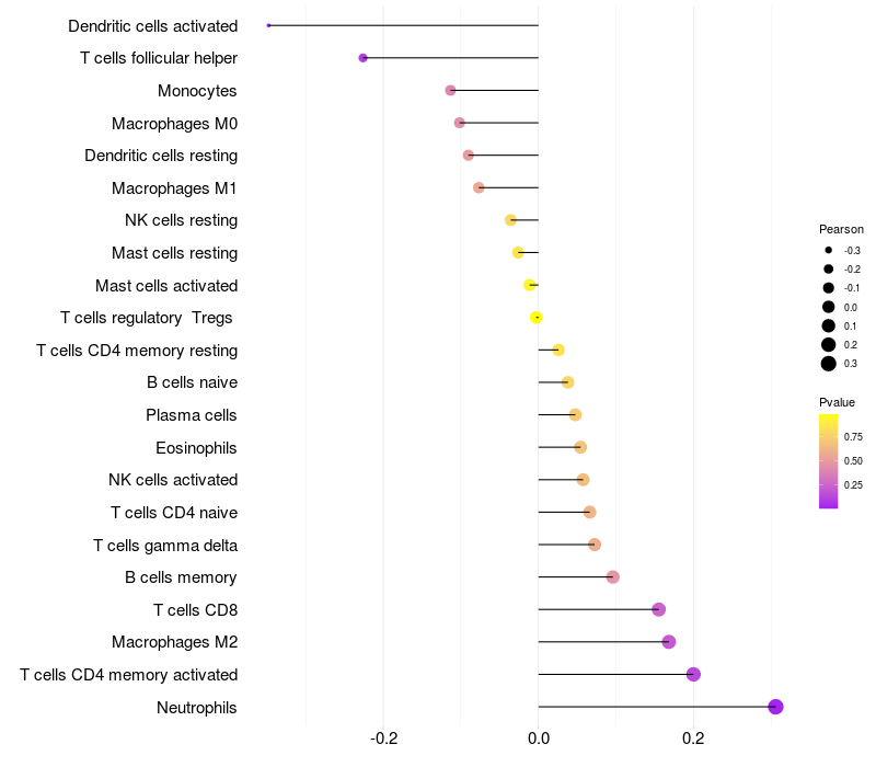 Lollipop of CGREF1 expression and immune infiltrating cell level correlation result in HPV+ samples