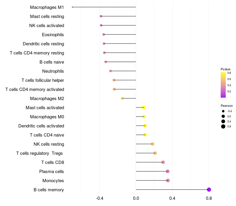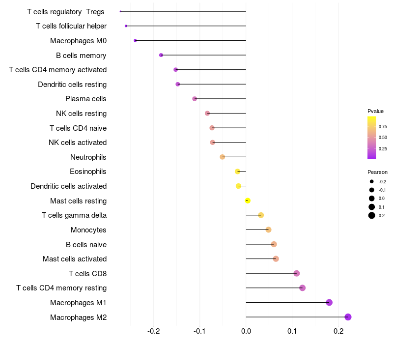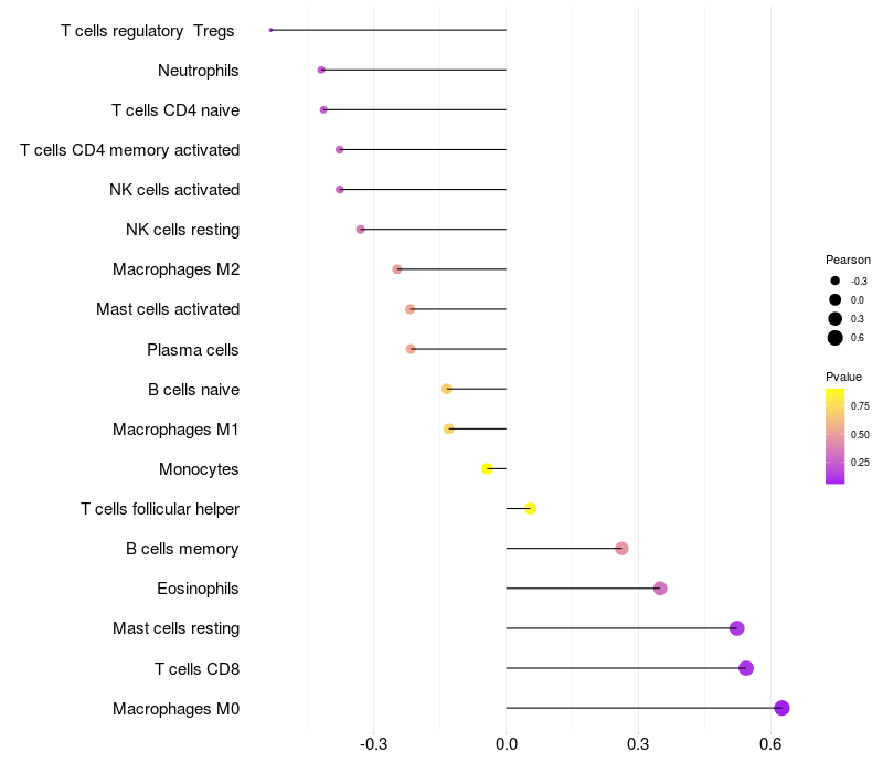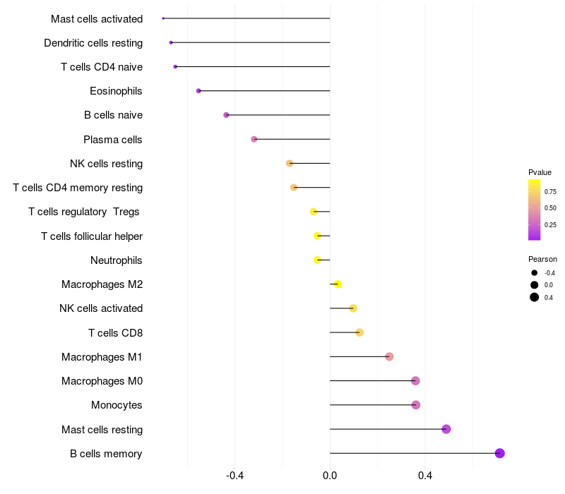 Lollipop of CHD9 expression and immune infiltrating cell level correlation result in HBV+ Liver cirrhosis samples