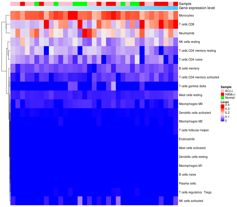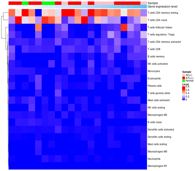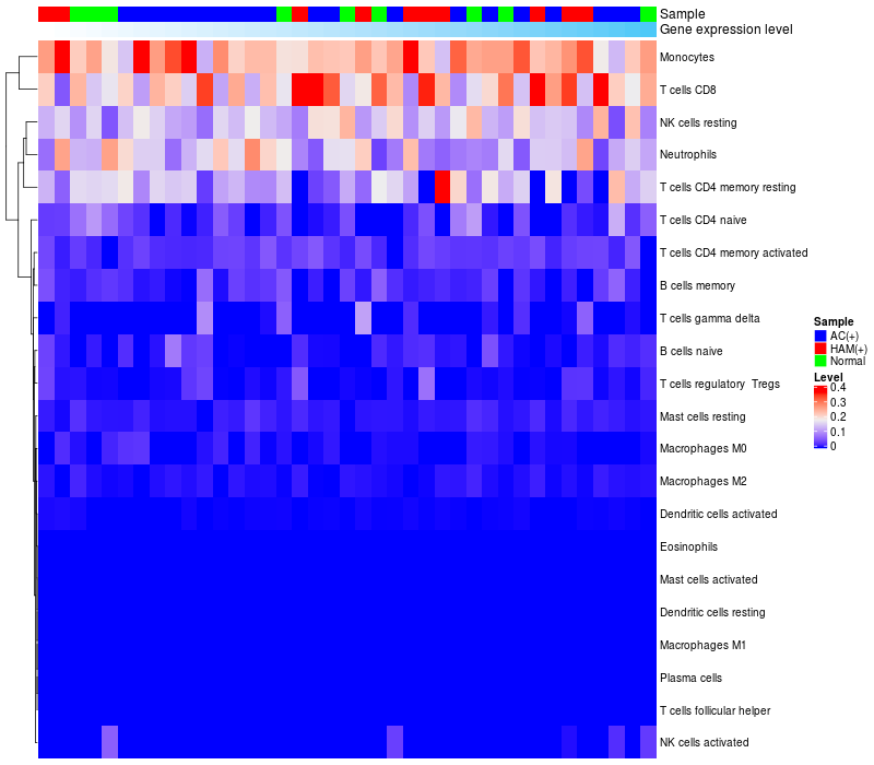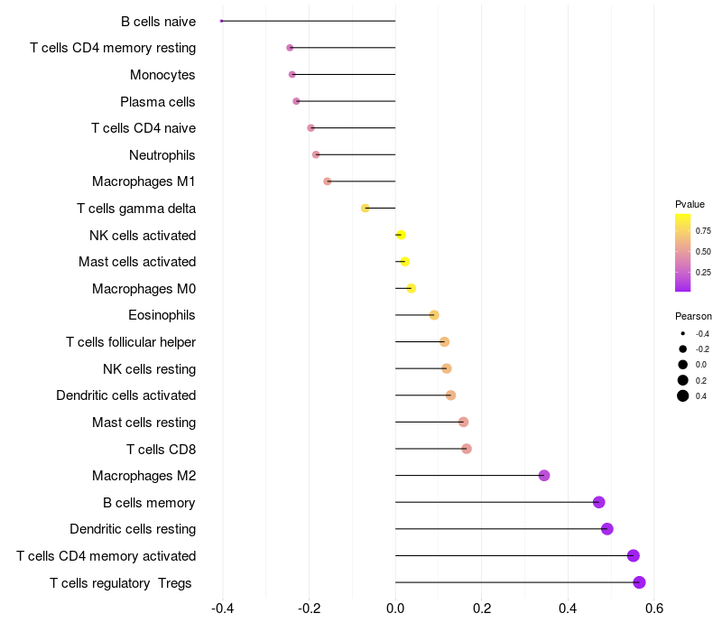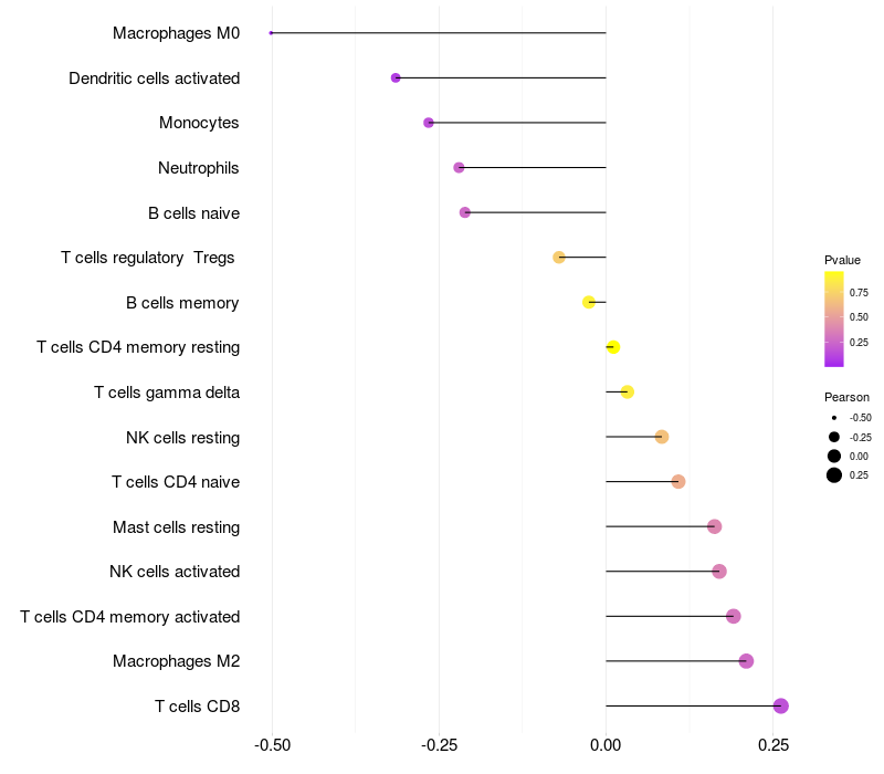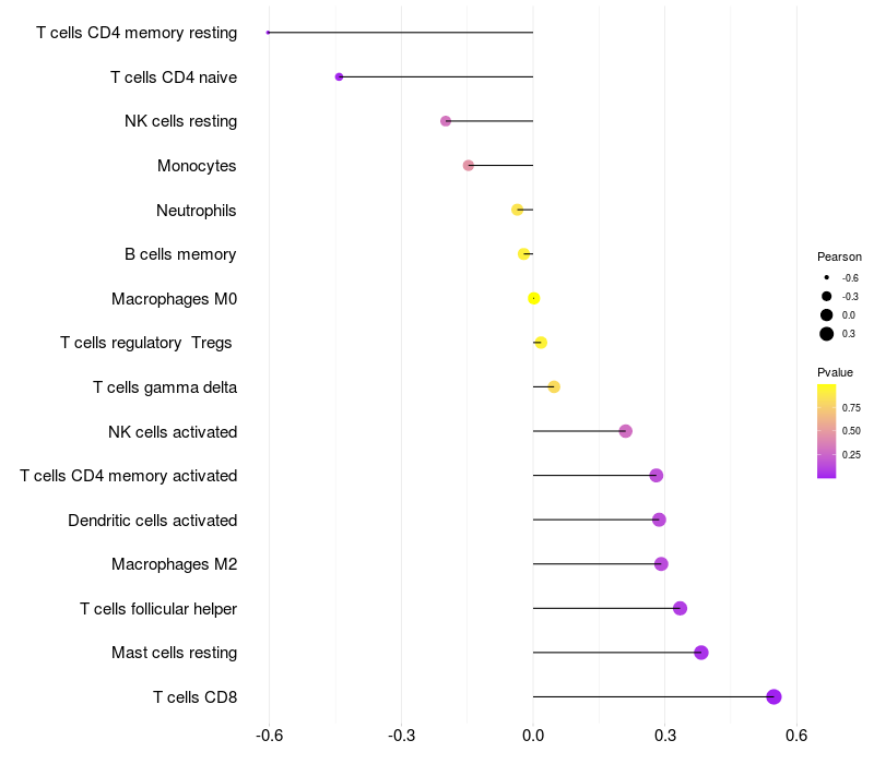 Lollipop of CHGB expression and immune infiltrating cell level correlation result in HTLV1+ samples