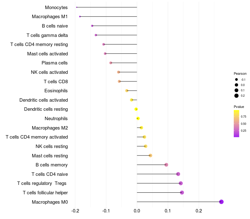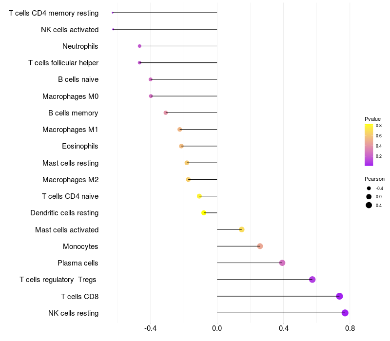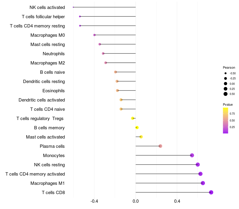 Lollipop of CHRDL2 expression and immune infiltrating cell level correlation result in HBV+ Liver cirrhosis samples