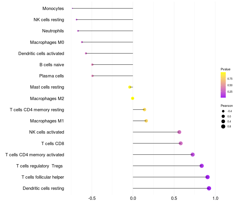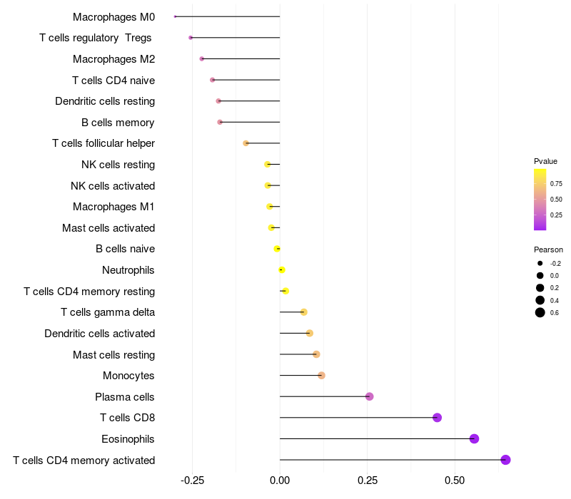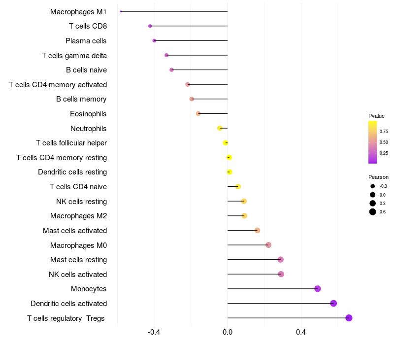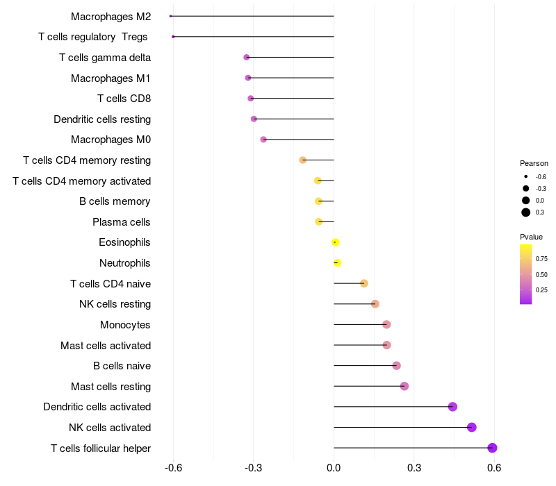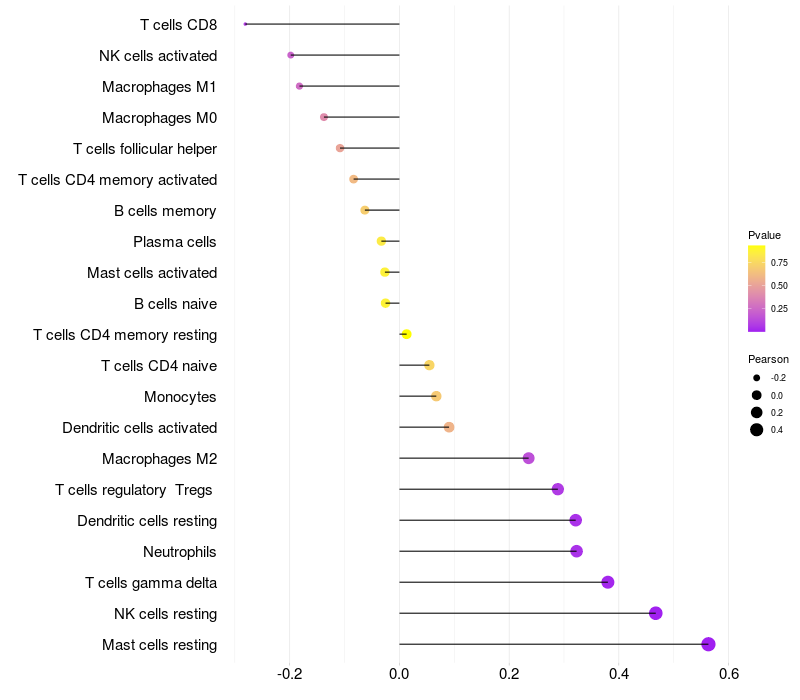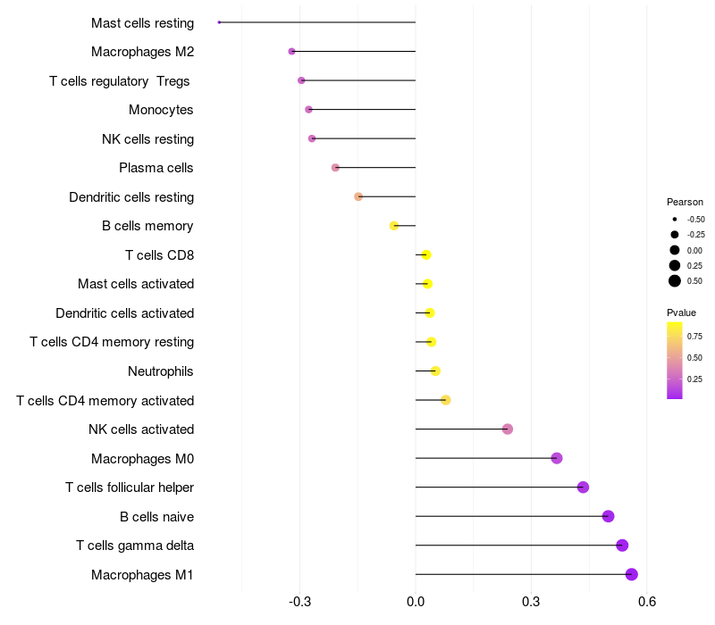 Lollipop of CHRM5 expression and immune infiltrating cell level correlation result in HPV+ samples