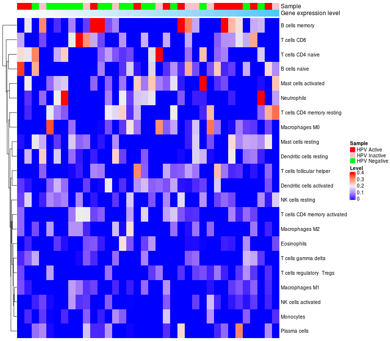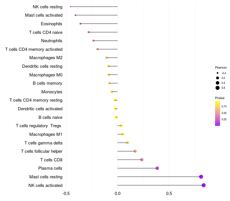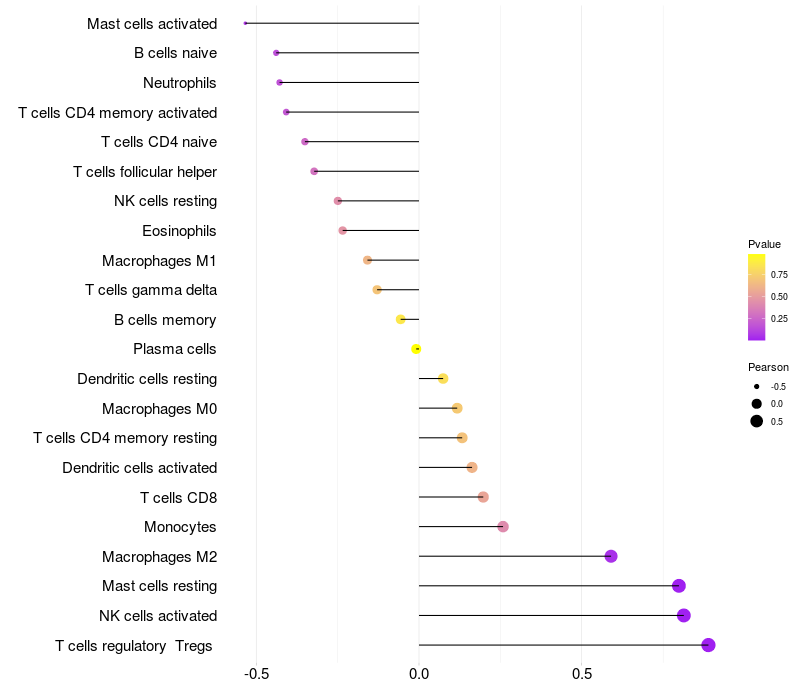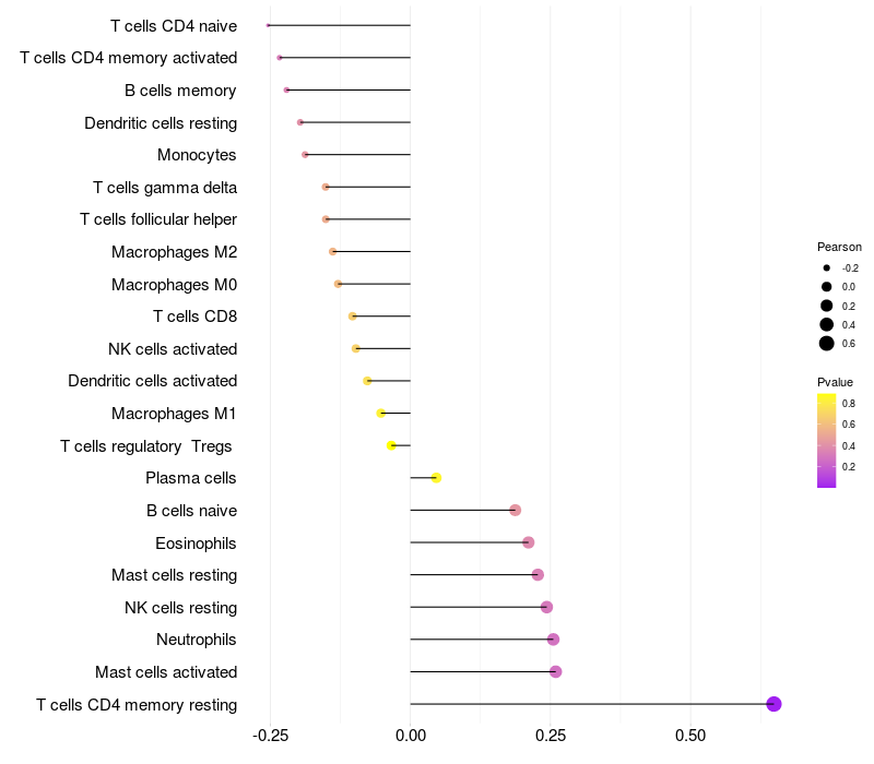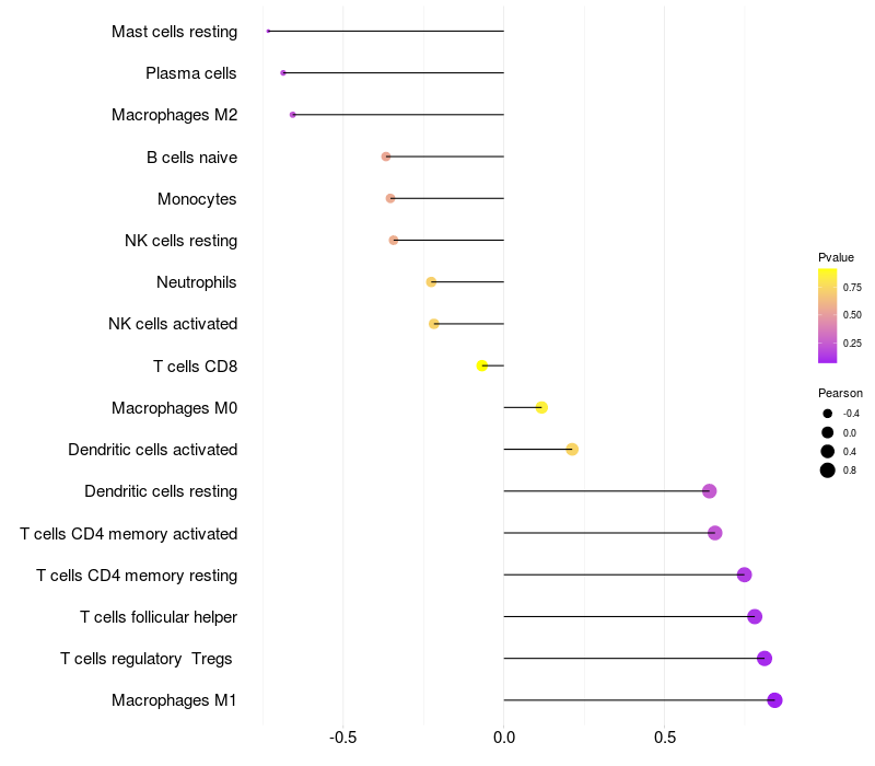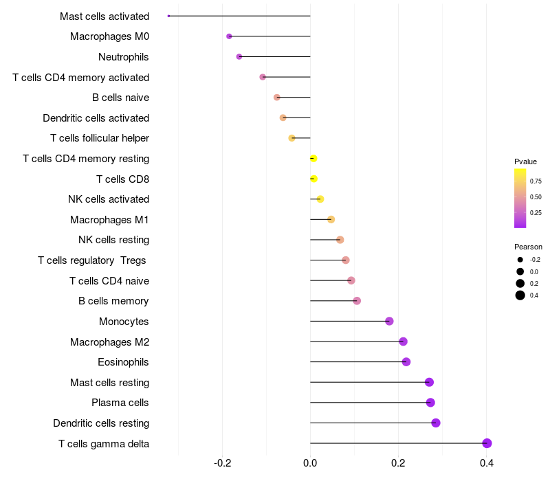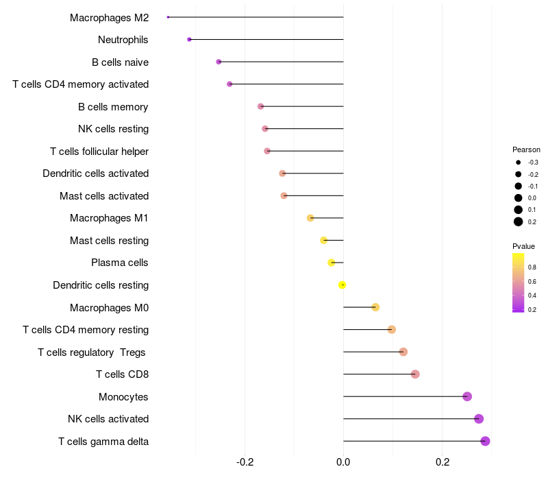 Lollipop of CHRNA2 expression and immune infiltrating cell level correlation result in HPV+ samples