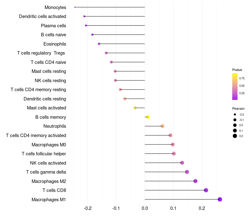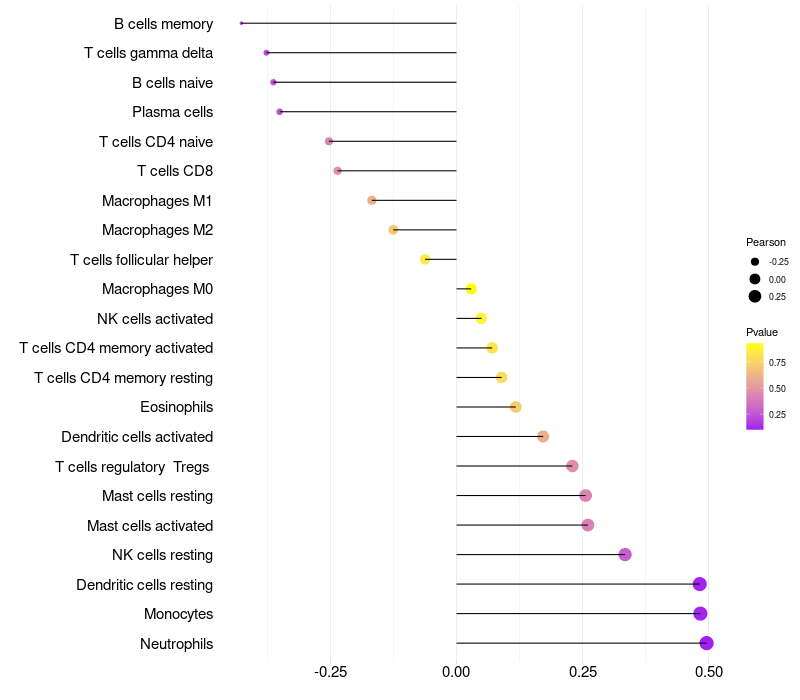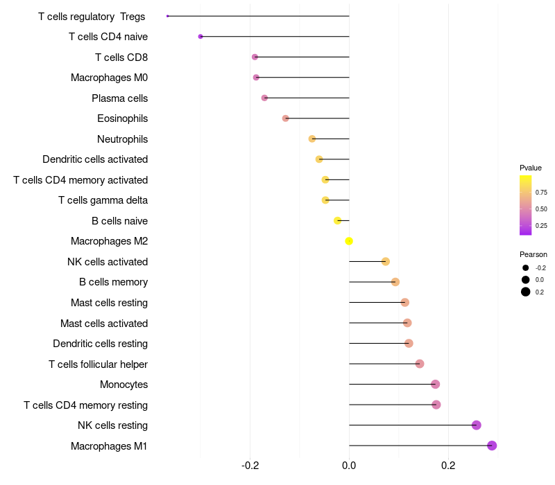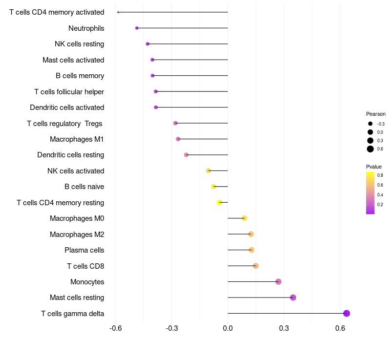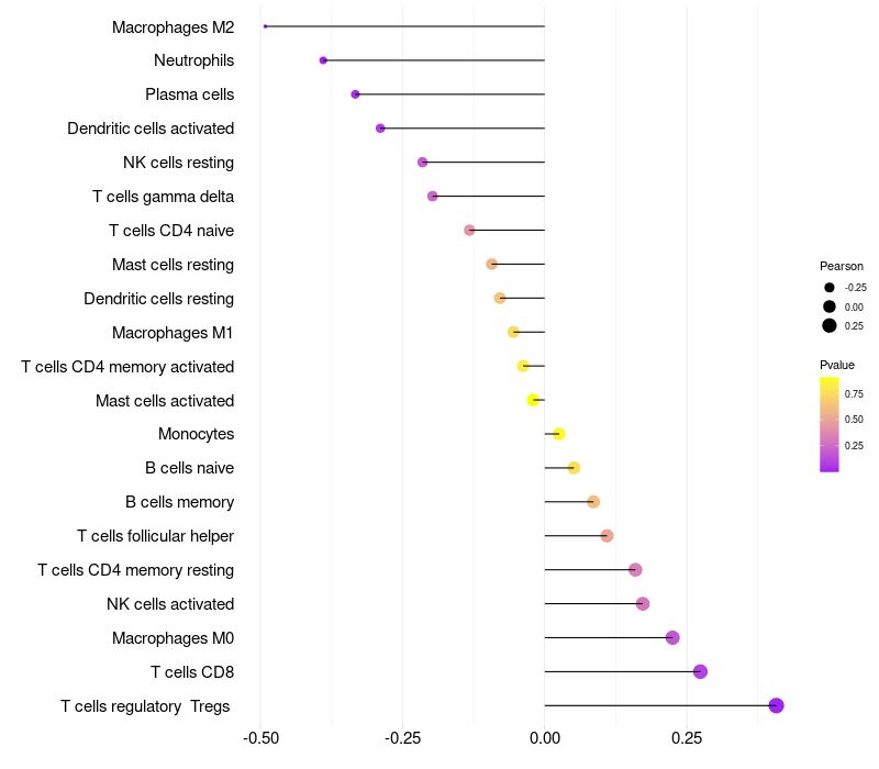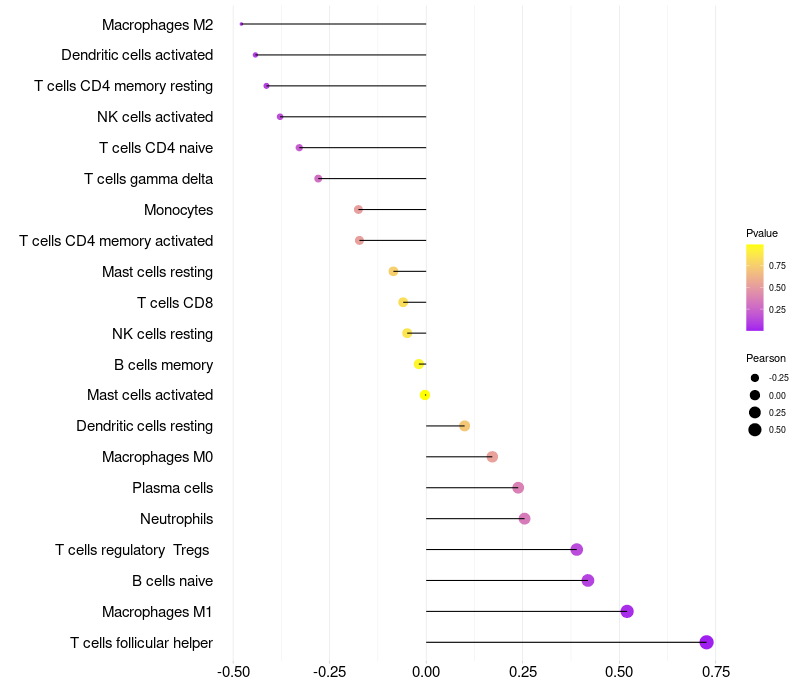 Lollipop of CHST14 expression and immune infiltrating cell level correlation result in HPV+ samples