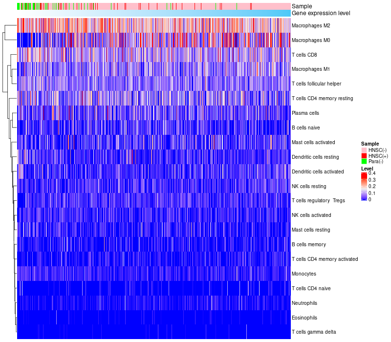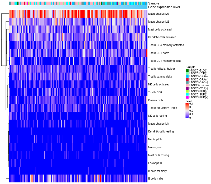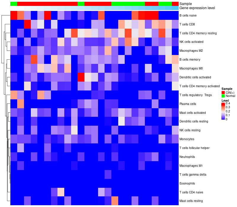 • Left: Heatmap of target gene expression and the level of various types of immune cells (cell type fractions) in all samples based on CIBERSORT method.