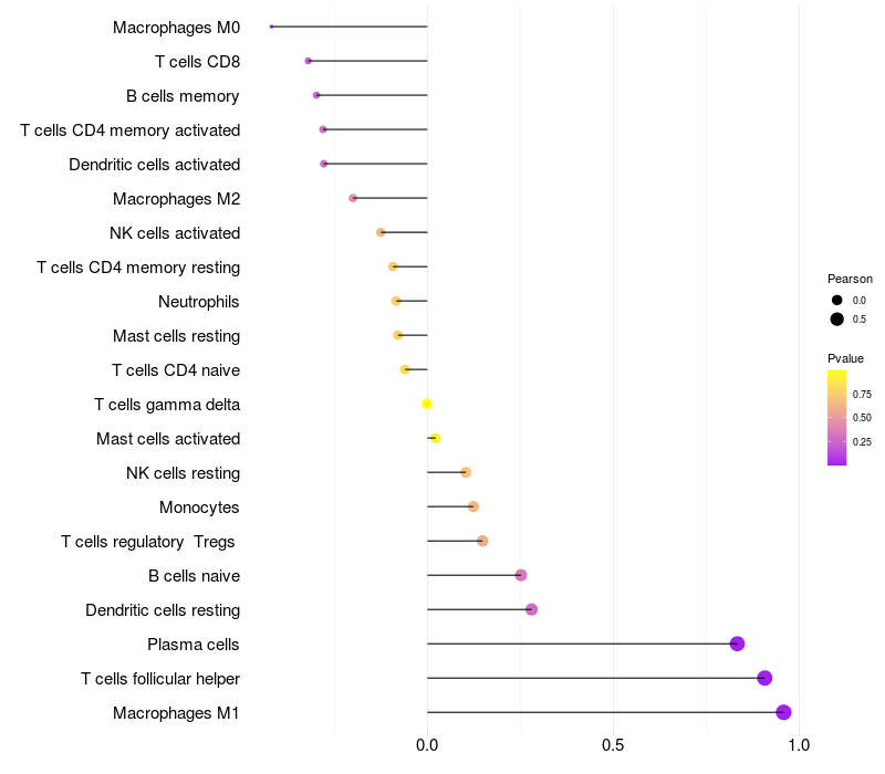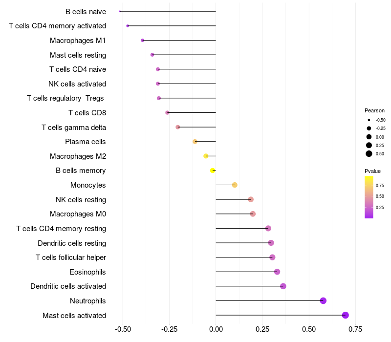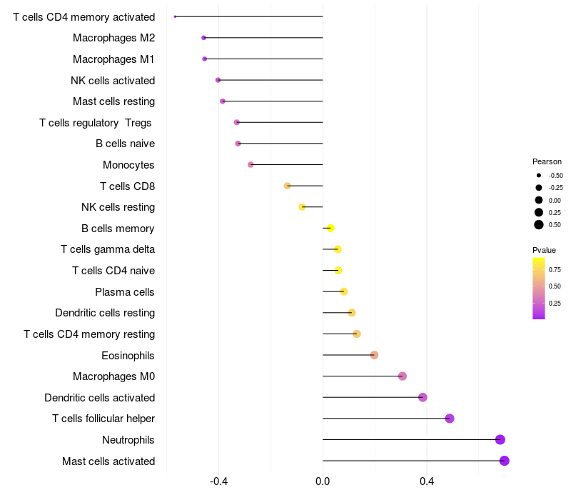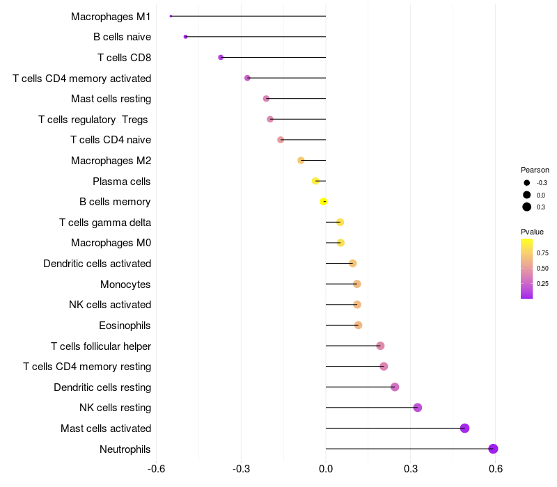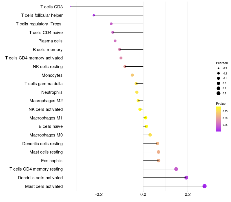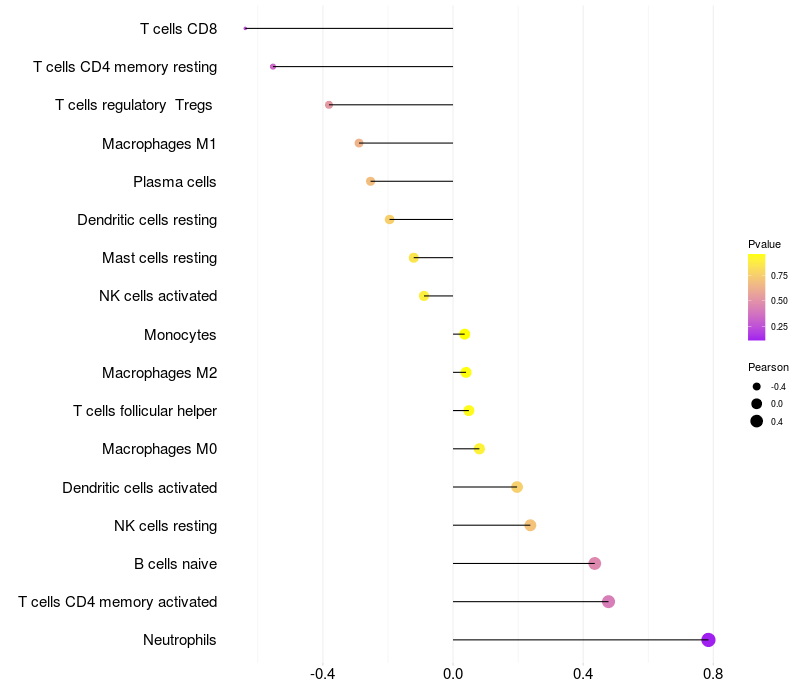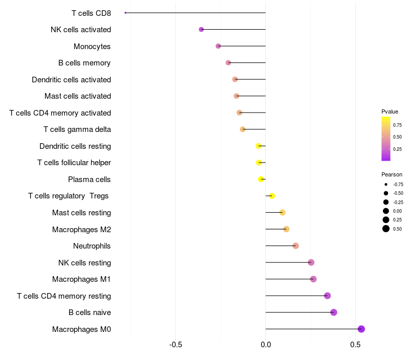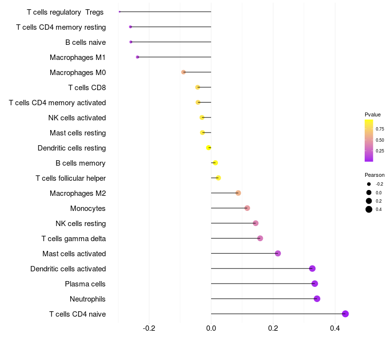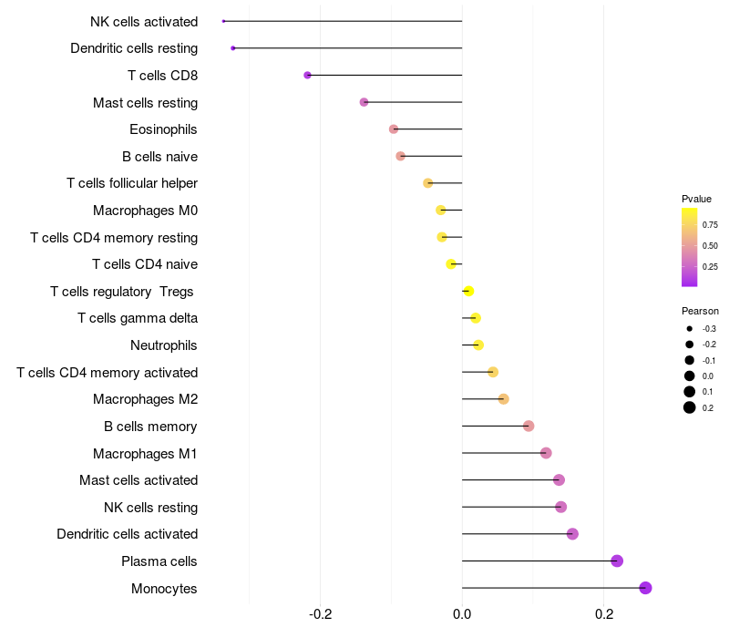 Lollipop of CIAPIN1 expression and immune infiltrating cell level correlation result in HPV+ samples