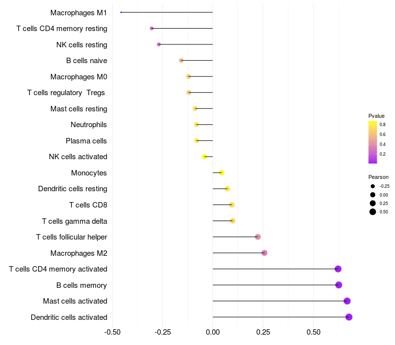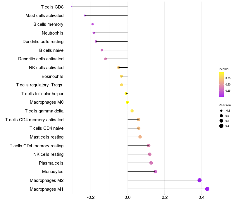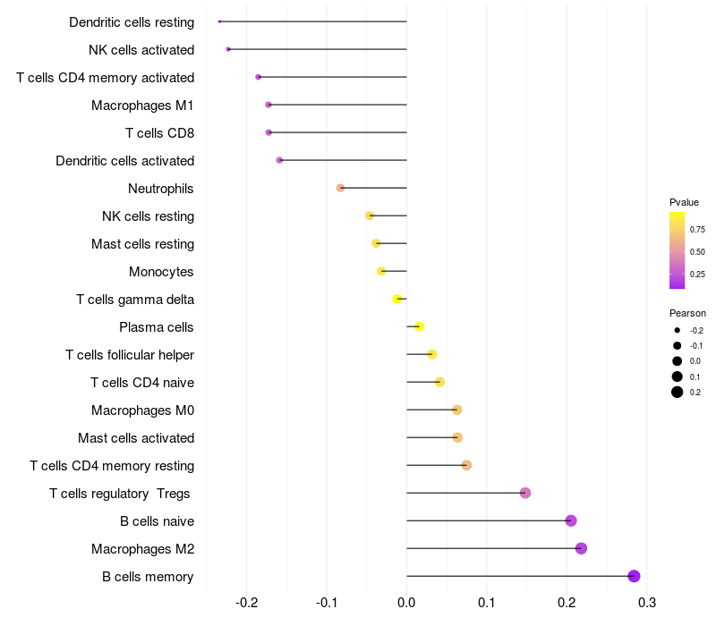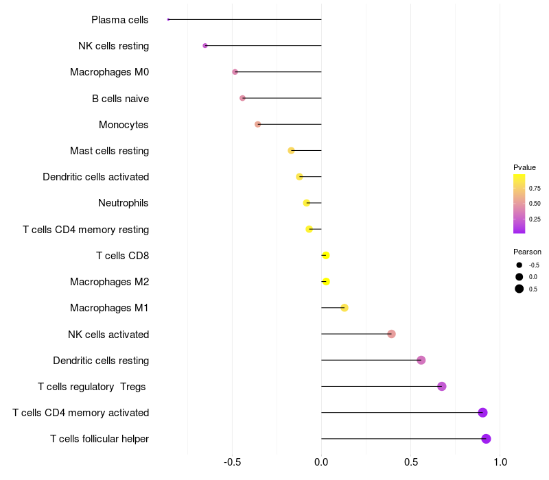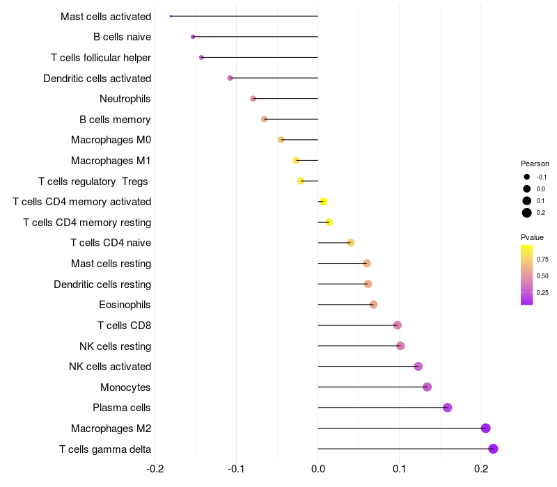 Lollipop of CIDEC expression and immune infiltrating cell level correlation result in HPV+ samples
