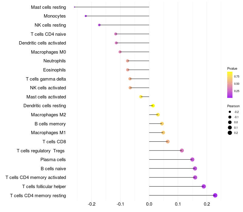 Lollipop of CIITA expression and immune infiltrating cell level correlation result in HBV+ samples