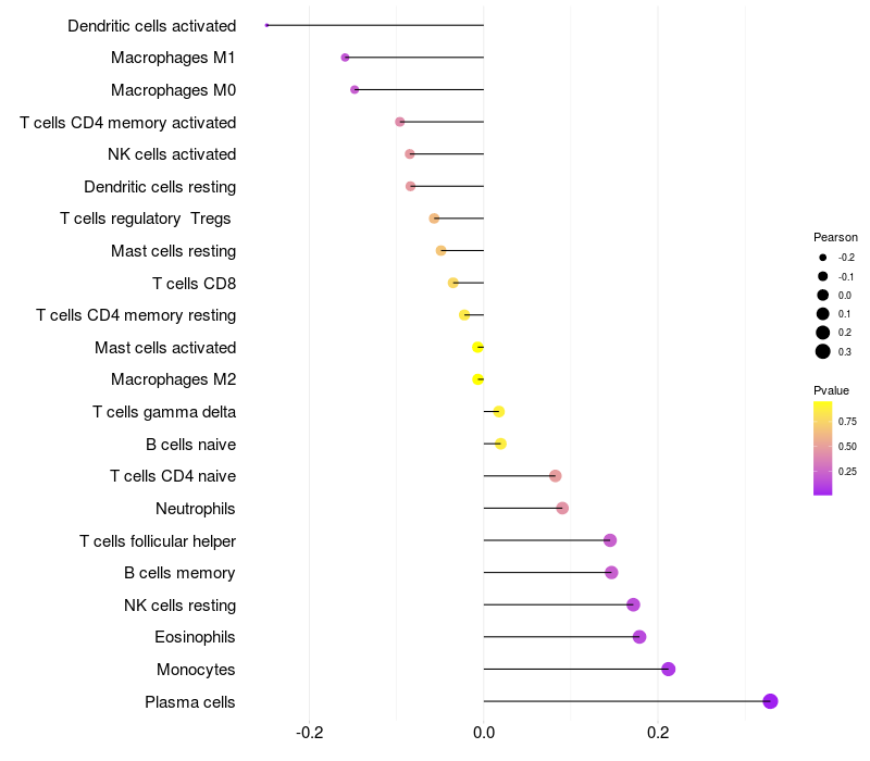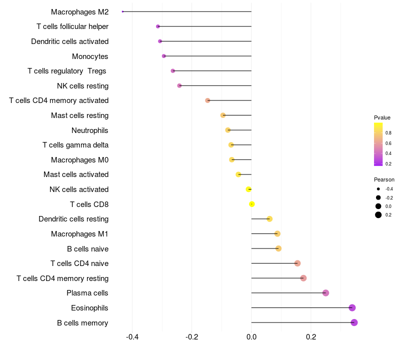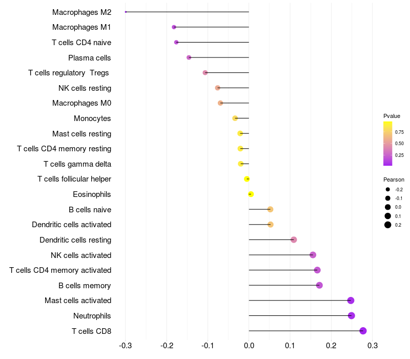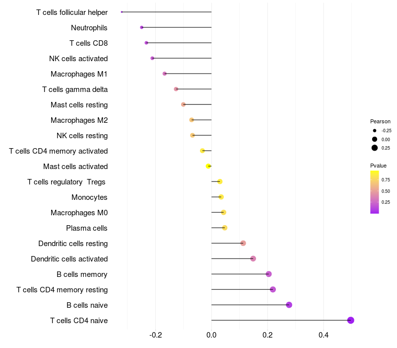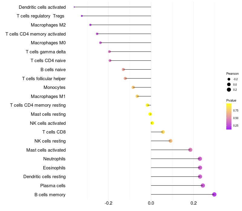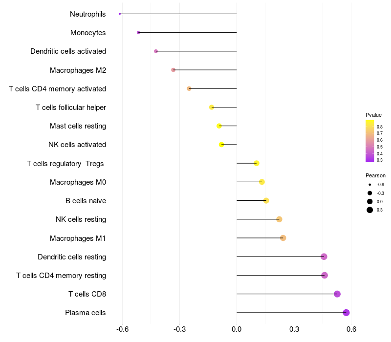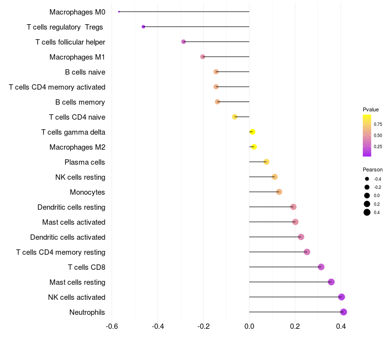 Lollipop of CITED2 expression and immune infiltrating cell level correlation result in HPV+ samples